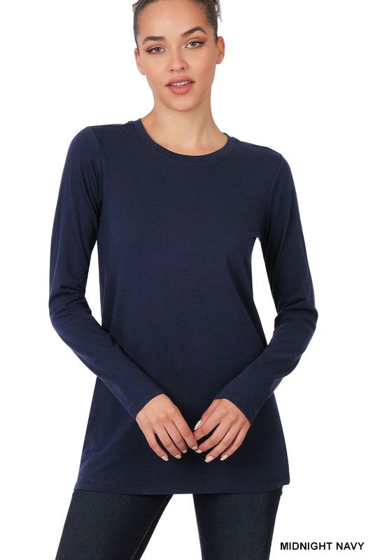 Basic and a perfect long sleeve layering top for this fall! Featuring long sleeves, a slim fit style with a round neckline. This top is available in five colors that will match with all the wraps, shackets, scarves and cardigans that you will wear this fall season!