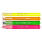 The highlighter set contains four bright colors - pink, orange, yellow, & green - allowing you to color-code to your heart's content! As an encouragement, a different verse is printed on the barrel of each of the four colors.