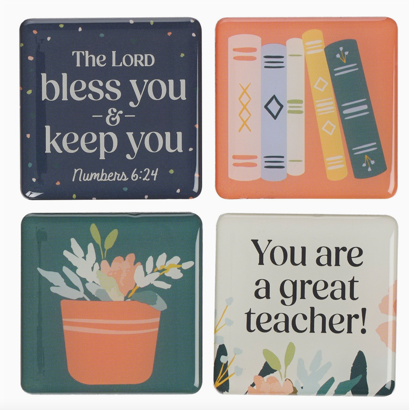 The Bless You and Keep You Magnet Set combines meaningful sentiments with charming designs. It's perfect for keeping important notes, reminders, or encouragement displayed in your classroom! Colorful floral, book, and confetti design, Silver-foiled text, Two images, Two sentiments, The Lord bless you and keep you - Numbers 6:24, You are a great teacher!, Bless You Teal Teacher Appreciation Collection, Set of 4 square magnets,