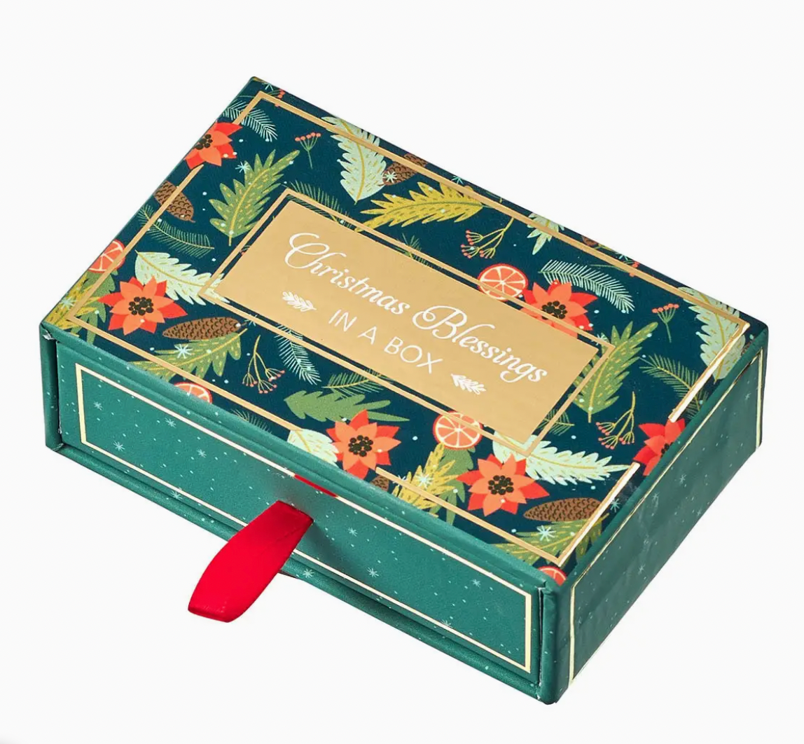 The Christmas Blessings Pass-Around Boxed Card Set is all you need to share many Christmas blessings and spread holiday cheer. Slip a card into a gift, leave one when you tip for a server, or use them as gift tags. Each card is a beautiful reminder of why we celebrate the most wonderful season of the year. Festive poinsettia design on box, Red ribbon pull, Slide out drawer, Gold-foiled details, 24 cards, 3 x 8 designs, Gold foil details, Card size: 3.2" x 2" (81 x 51mm), Box size: 3.7" x 2.3" x 1.2"