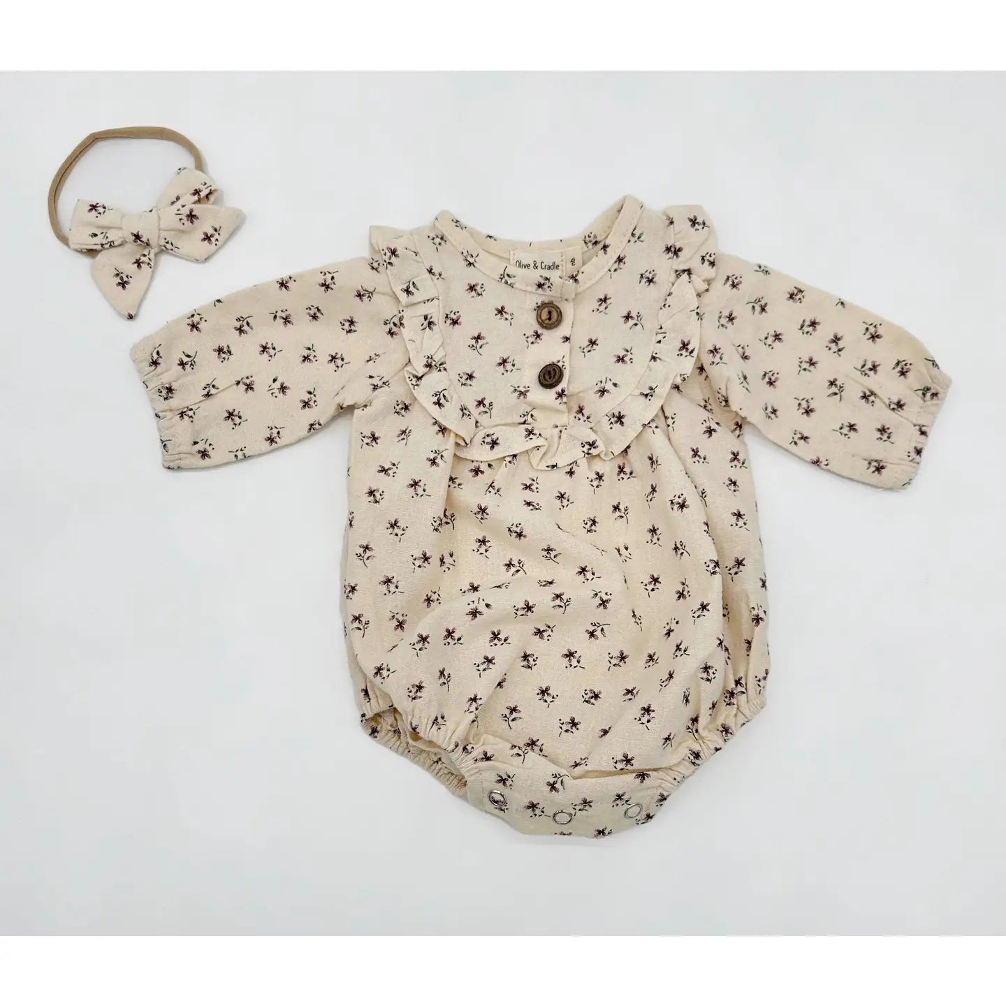 The Claudia floral romper is an elegant peter front ruffle romper made from 100% cotton with elegant wooden buttons on the front.