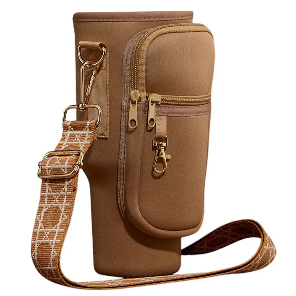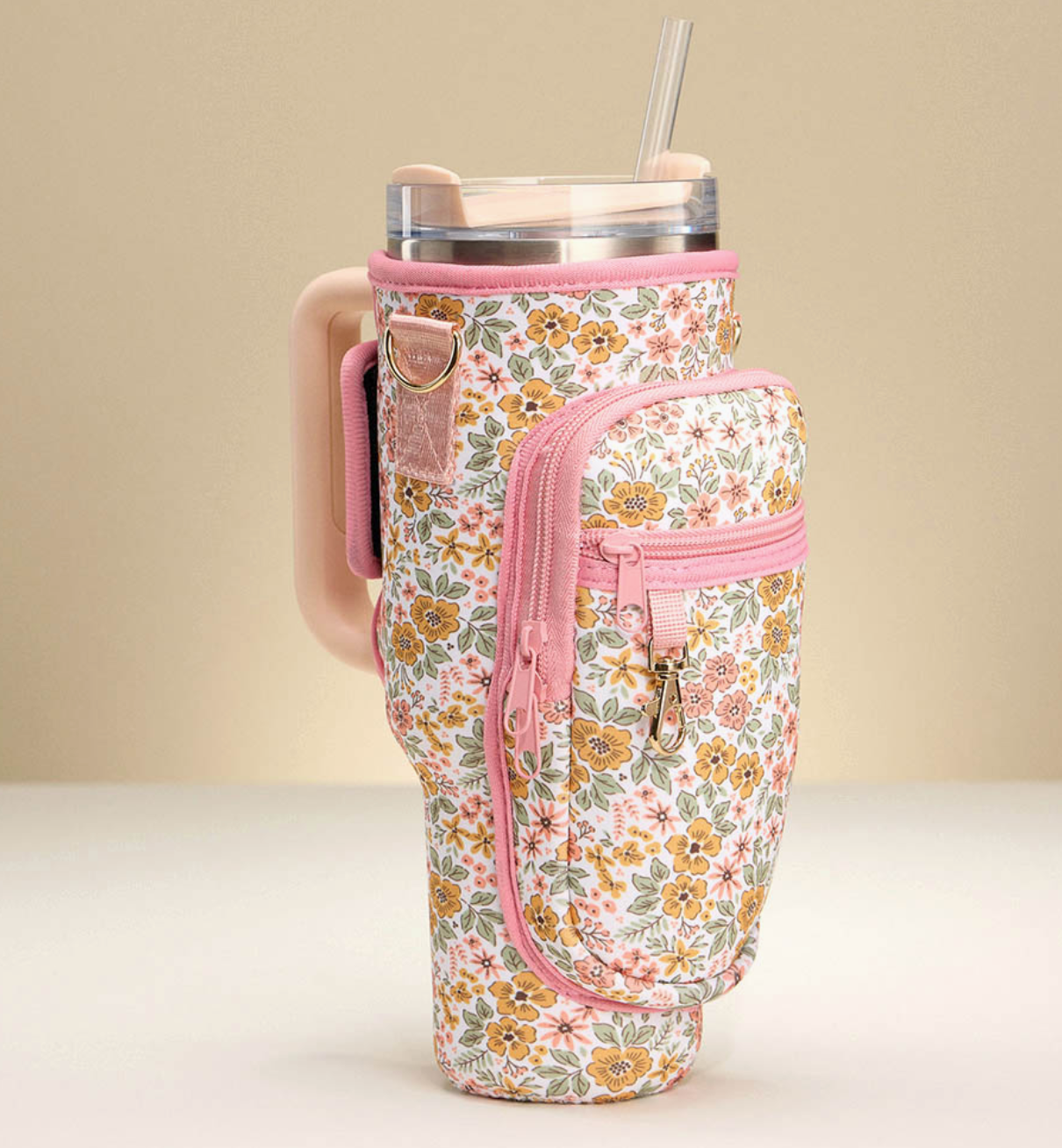 Flower Pattern Tumbler Carrier Holder Bag • Size : 3" X 3" X 10" • Strap Size : Adjustable, Detachable • Two Outside Zipper Pocket • Fits Stanley Tumbler 40oz • Material : 100% Neoprene • **Tumbler Not Included**