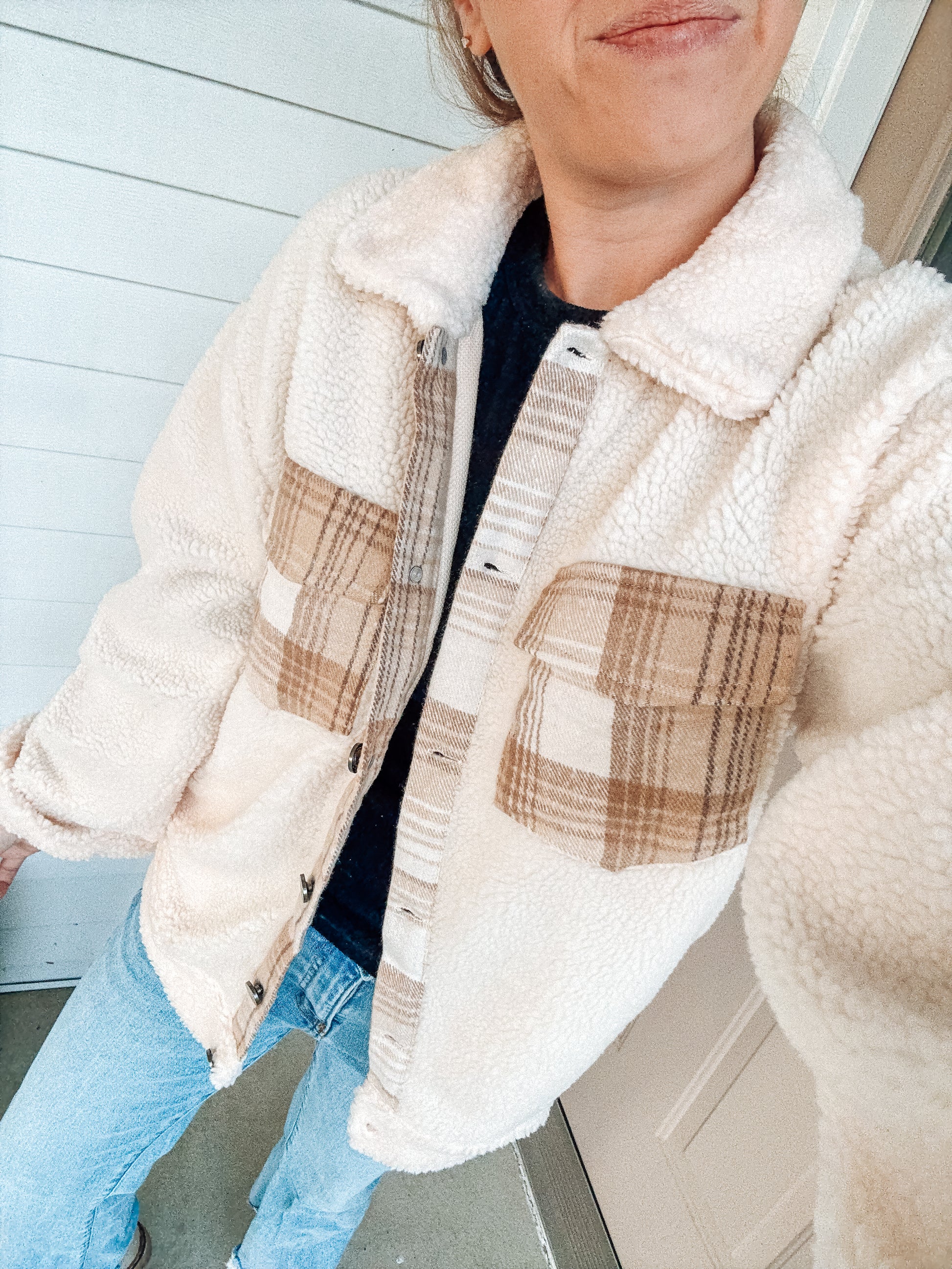 Stay stylish and cozy with the Dora Plaid Accent Shacket, available in sizes S-3X. This sherpa-lined shacket features a classic collar and eye-catching plaid contrast detailing that adds a trendy touch to your look. Functional front plaid flap pockets with button closures provide practical storage and elevate the design. Perfect for layering, it combines warmth and fashion effortlessly for your everyday adventures.