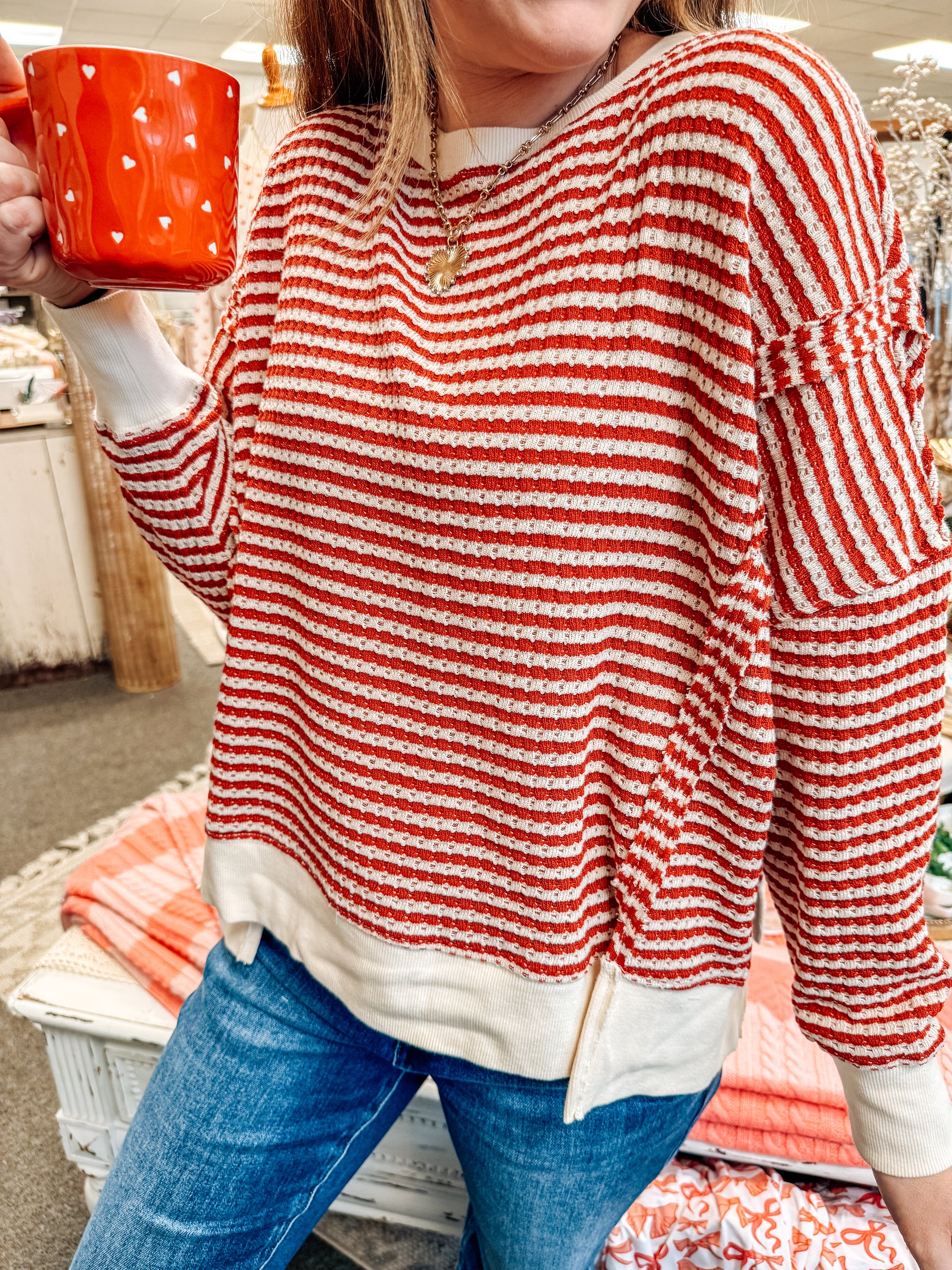 The Effortlessly Striped Top in red combines contemporary design with everyday wearability. This relaxed-fit piece features a classic round neckline and long sleeves with a modern drop shoulder construction that creates an intentionally slouched silhouette. Exposed seam detailing adds visual interest, while the split hem provides subtle movement and dimension. The timeless stripe pattern offers versatile styling options for casual and layered looks alike.