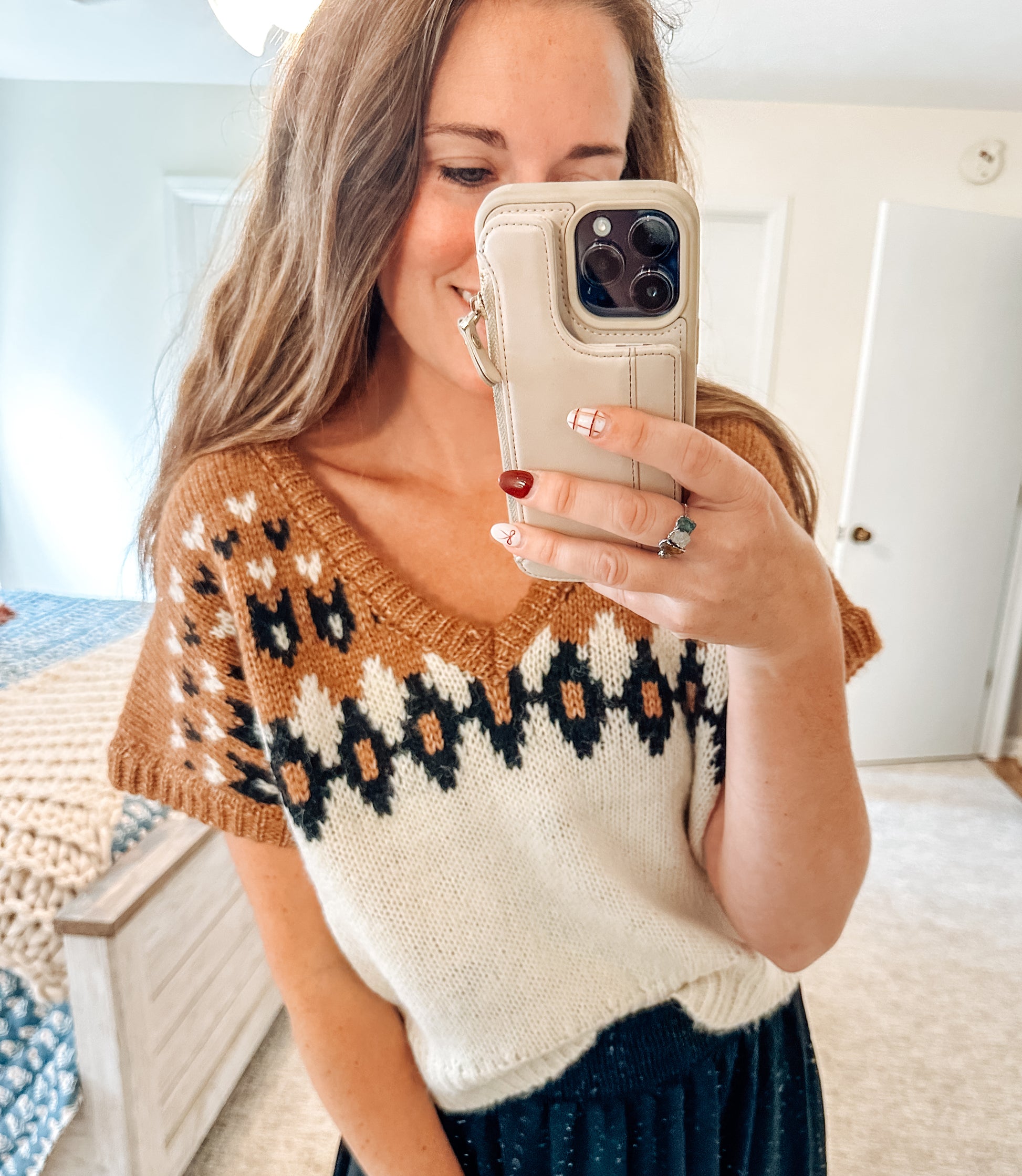 This Fair Isle Short Sleeve Sweater is the perfect fall staple. Crafted with an ivory base and accented by camel and black contrasts, its V-neckline adds a flattering, stylish touch. The short sleeves make it ideal for layering or wearing on crisp autumn days, delivering warmth and elegance in one versatile knit top. Elevate your seasonal wardrobe with effortless charm and comfort.