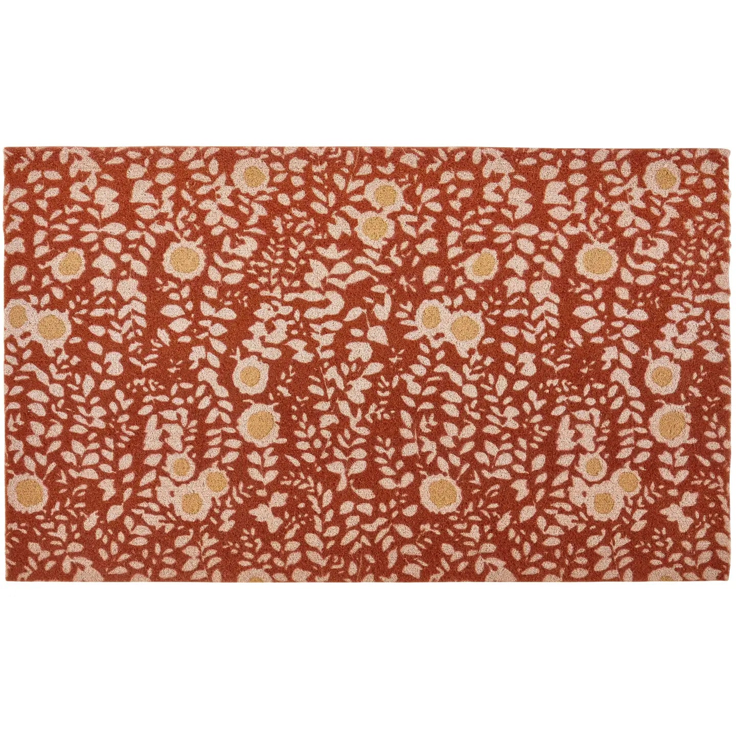 A durable faux coir rug from our Fall & Harvest Collection displaying an all-over print of a fall wildflower inspired pattern. Faux coir offers the benefit of not shedding over time, unlike natural coir rugs, so the integrity of the design and colors will last longer. Rug can be used indoor or outdoor and features skid-resistant backing to help stay in place. Spot cleaning recommended. Our Fall Wildflowers rug comes packaged neatly rolled with tag displaying full rug design. A fall-themed seasonal home accent that adds functional style.