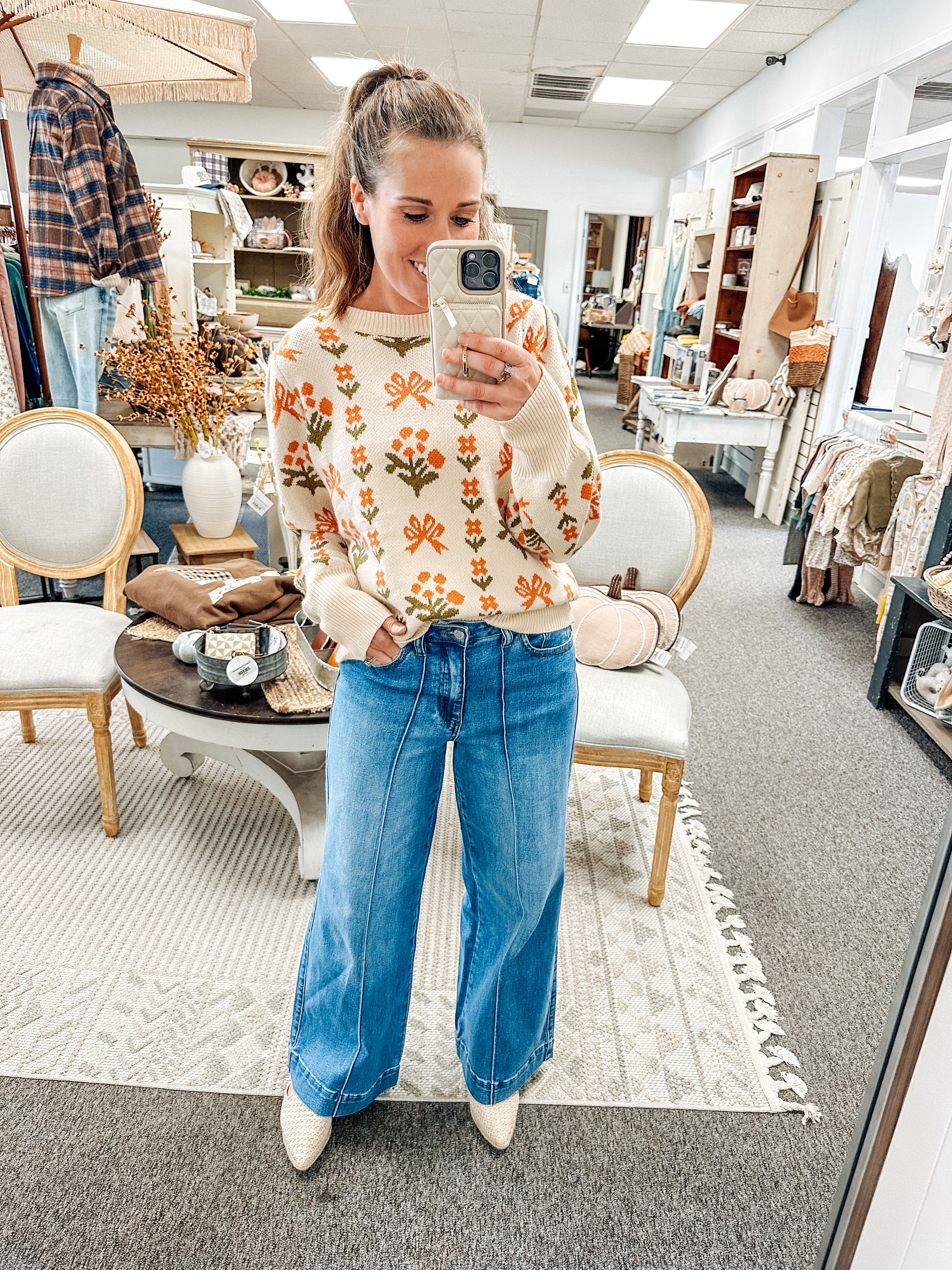 The Floral Stitch Pullover is a playful and charming sweater top featuring long puff sleeves and delicate shoulder pintuck details. Its vibrant floral pattern adds a fun, lively touch, making it a perfect choice to brighten your day and keep cozy in style.