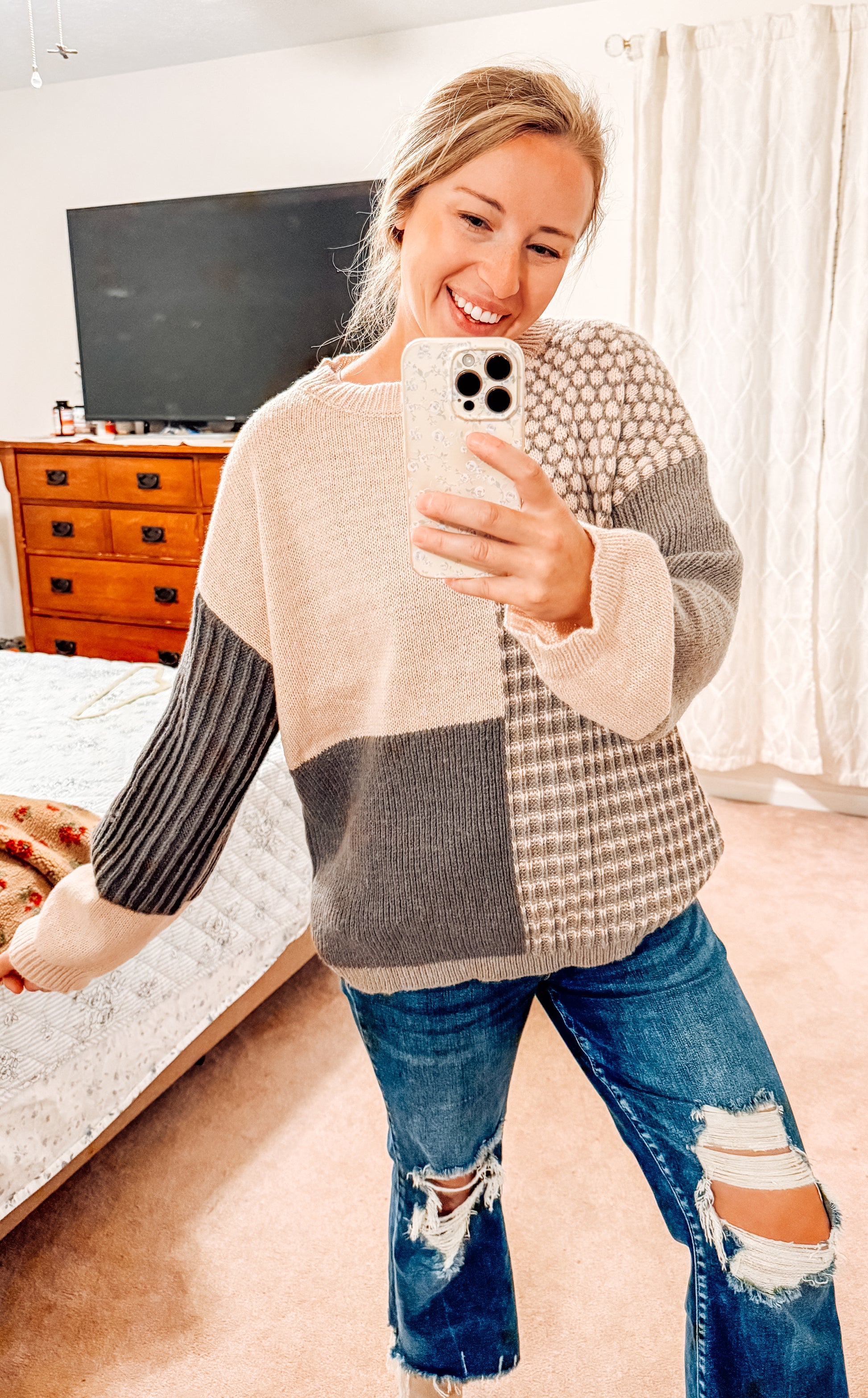 Stay cozy and stylish with the Foggy Mornings Colorblock Sweater. This long-sleeve knit features a unique mixed pattern block design that adds visual interest to your wardrobe. Perfect for cooler days, its soft fabric keeps you comfortable while elevating your look effortlessly. Available in sizes S to XL, it's a versatile staple that pairs well with any casual outfit. Embrace warmth and fashion in one beautiful sweater.