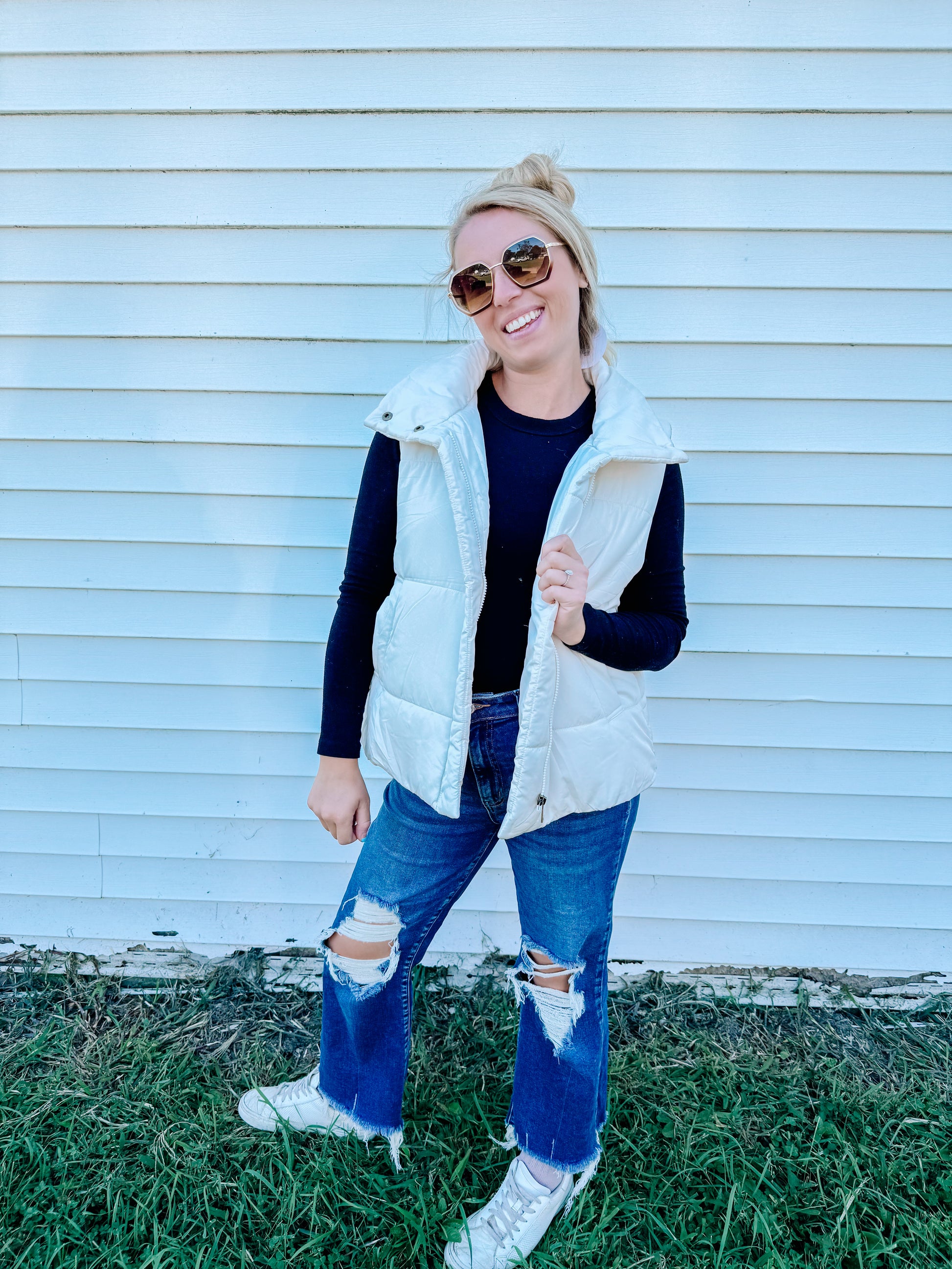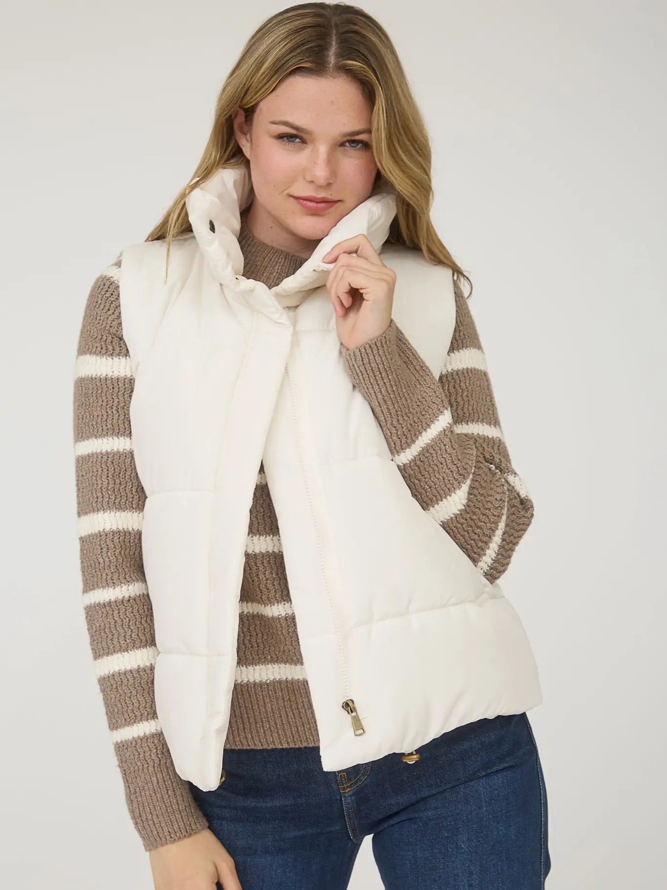 Stay cozy and stylish with the Frosted Layer Puff Vest! This sleeveless vest features a high neck and convenient zip-up front, perfect for layering on chilly days. With handy pockets to keep your essentials close, its solid color makes it easy to pair with any outfit. Available in sizes S to 3X, it’s your go-to for warmth and playful flair.