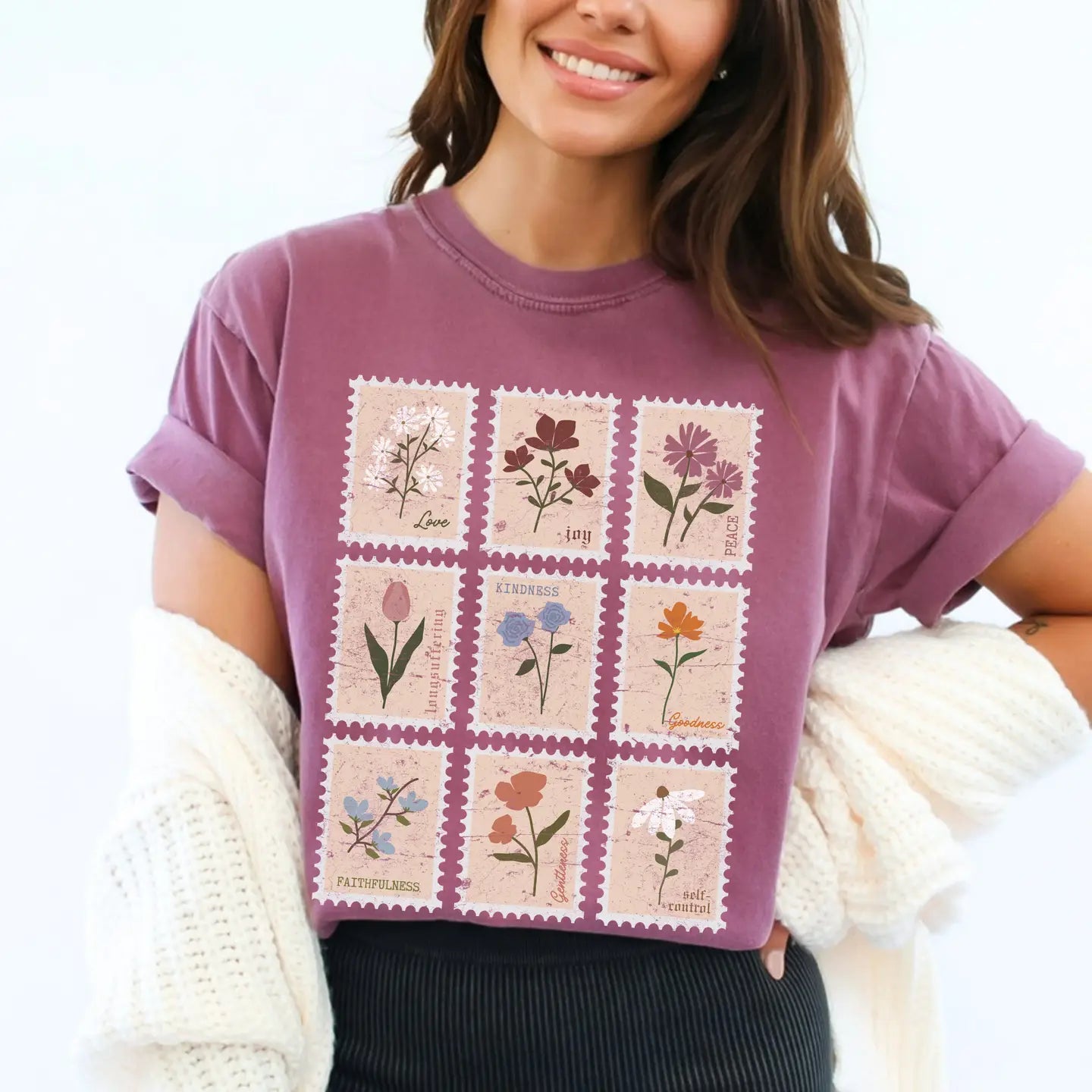 This beautifully designed Comfort Colors t-shirt features a unique vintage-inspired postage stamp print, each adorned with delicate wildflowers representing the fruits of the Spirit. With hand-drawn botanical details and soft, earthy tones, this design showcases words like "Love," "Joy," "Peace," "Kindness," "Faithfulness," and more, making it a meaningful and faith-filled statement piece.