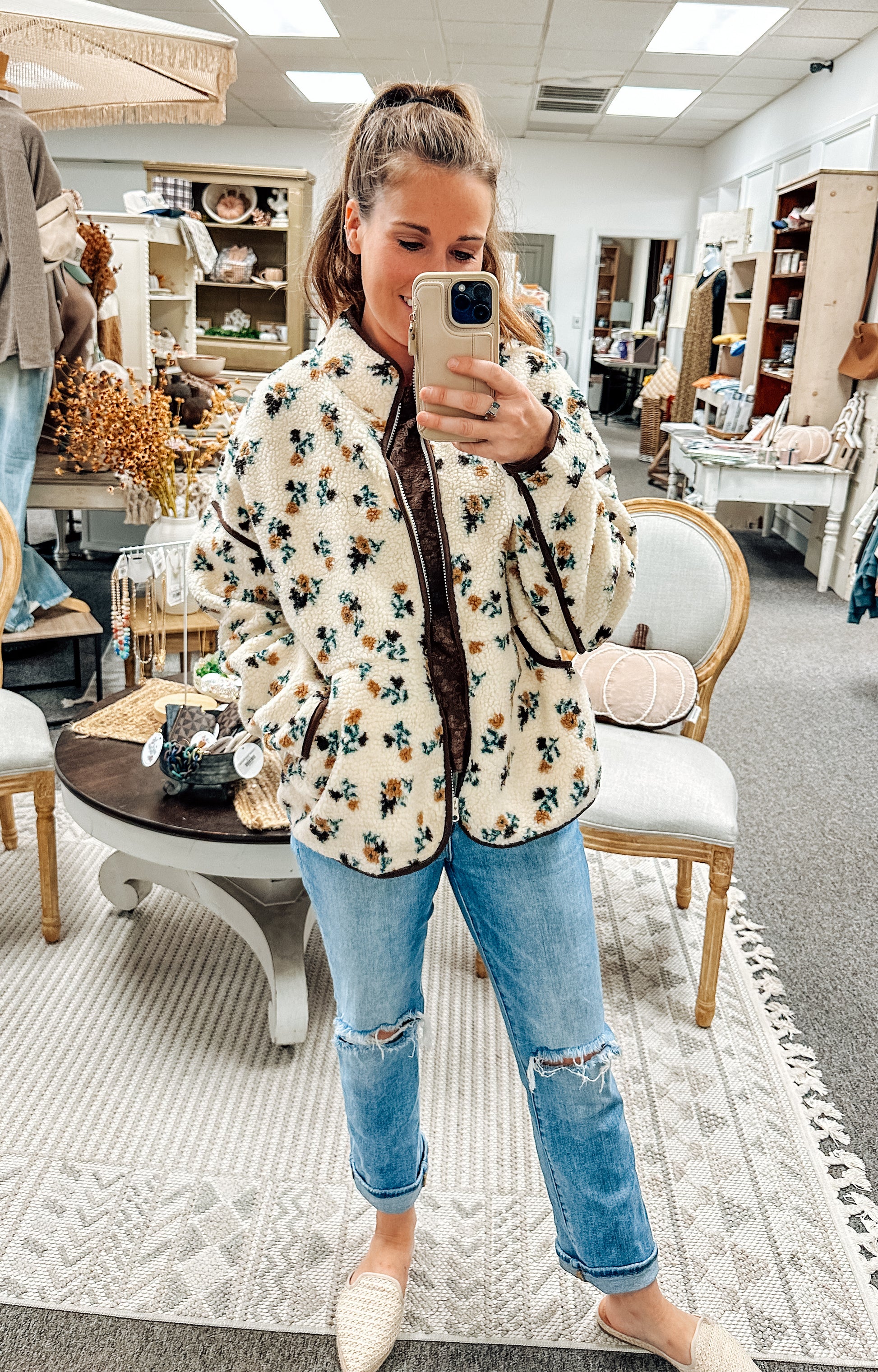 Wrap yourself in cozy charm with the Garden Chill Fleece Zip Up. Featuring an oversized fit and playful floral print, this jacket brings casual comfort to a whole new level. The high neck and front zip keep you snug, while drop shoulders and side pockets add relaxed style and practicality. Perfect for breezy days when you want to feel warm and effortlessly cool.