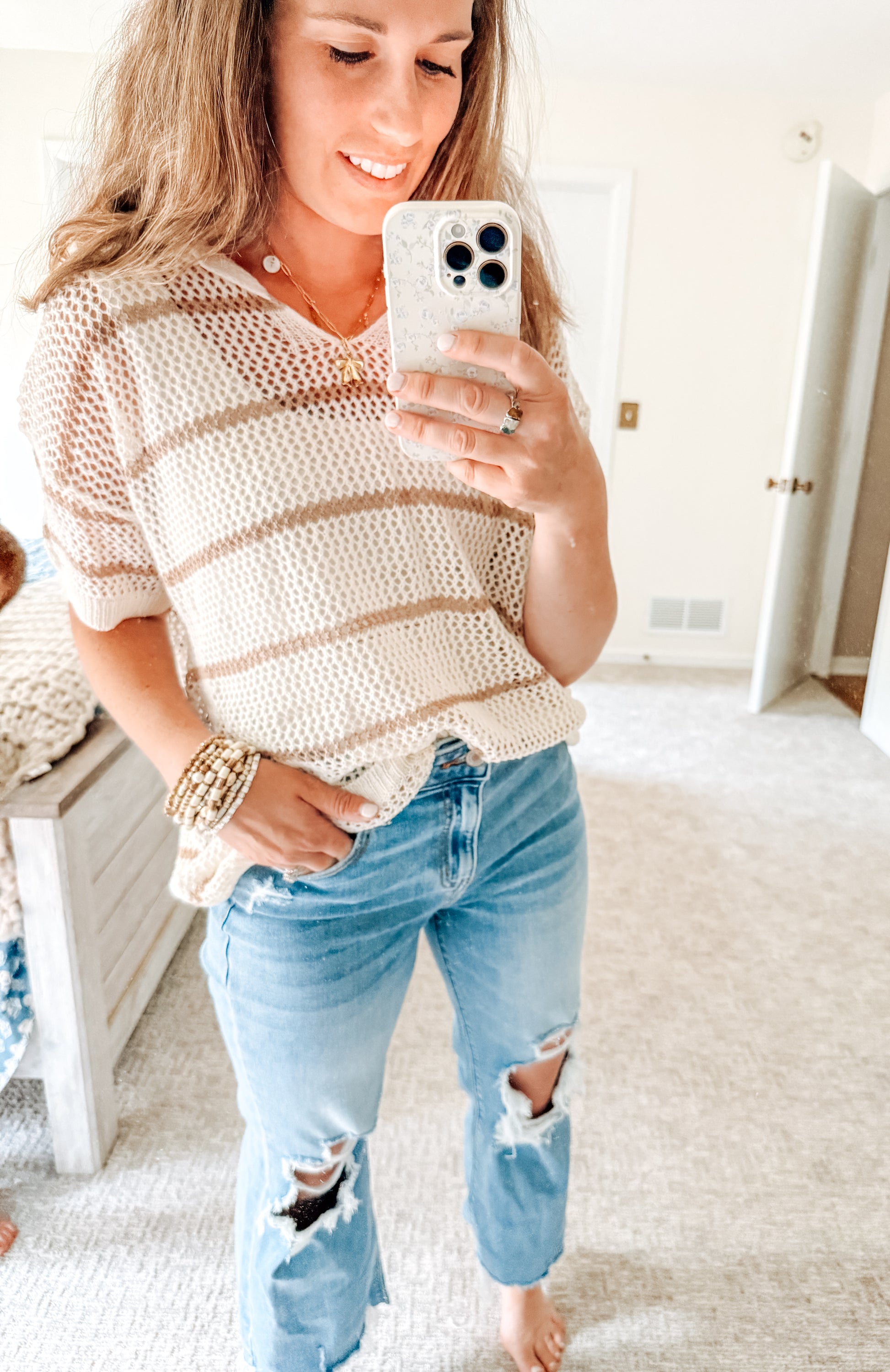 Dive into fun with the High Tide Open Knit Top! Featuring playful stripes and breezy short sleeves, this lightweight knit is perfect for sunny days and cool evenings. Its open weave adds a flirty touch while keeping you comfortably stylish from S to XL. Make waves wherever you go!