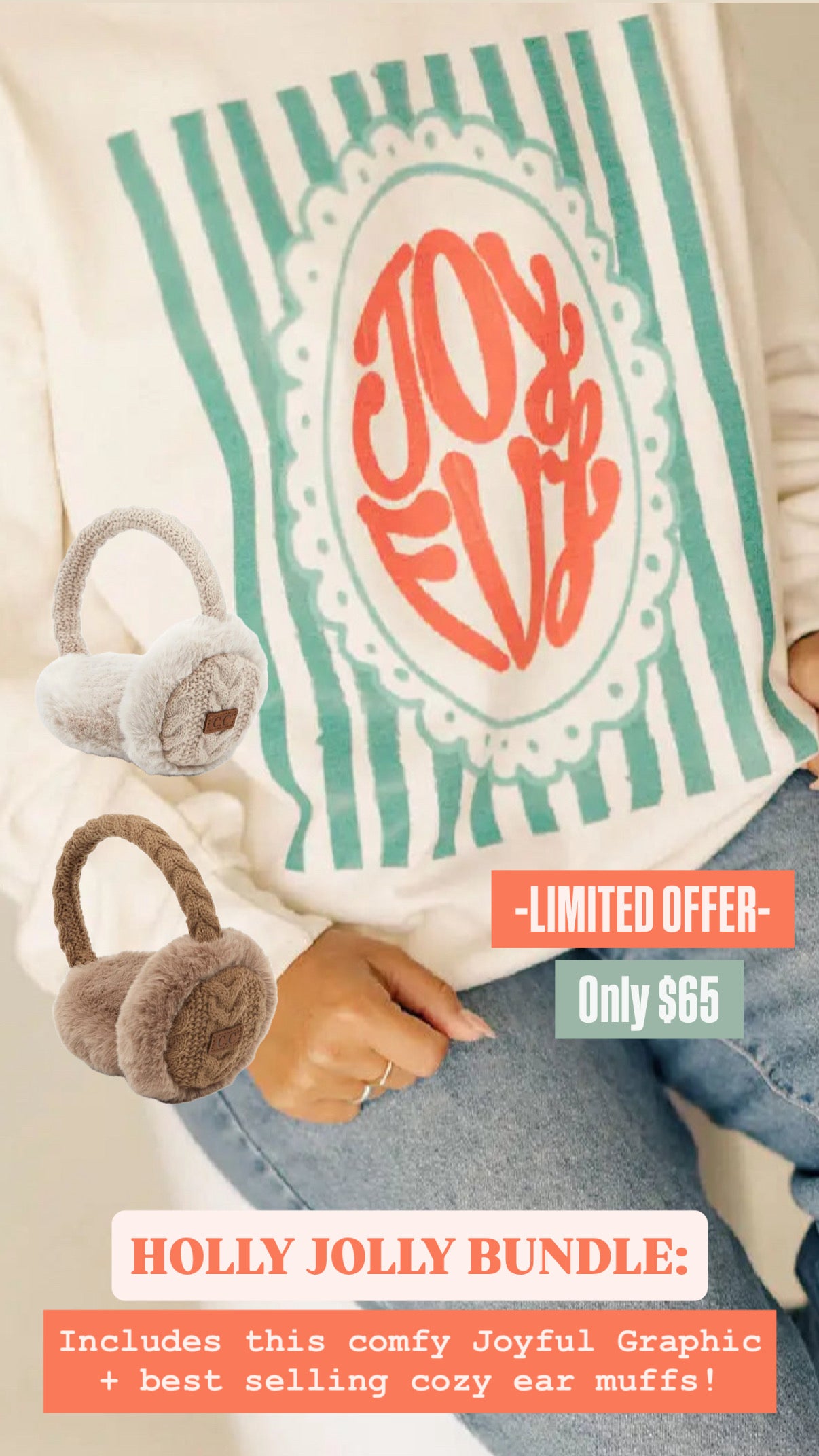 Spread holiday cheer with our Holly Jolly Bundle! This festive package pairs a charming Christmas graphic with our bestselling ear muffs—the perfect cozy combo for staying warm and merry all season long. Whether you're treating yourself or surprising someone special, this bundle delivers comfort wrapped in seasonal joy. Get ready to turn heads and warm hearts!