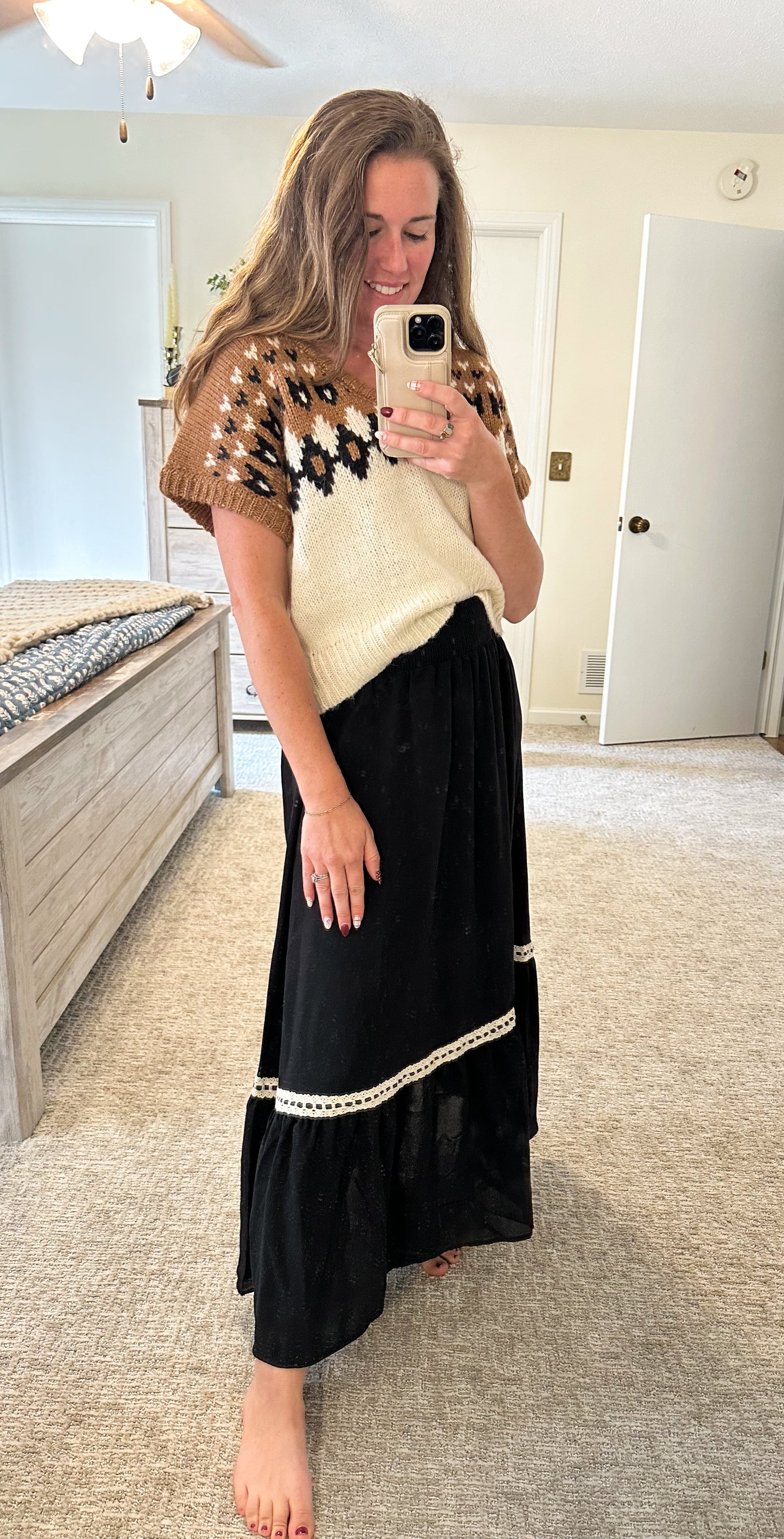 This playful midi skirt features a high, smocked elastic waist for a comfy fit and a flattering A-line silhouette. The contrast lace trim with delicate ribbon adds a touch of charm, while the ruffle hem brings a flirty finish. Fully lined for comfort, it’s perfect for twirling into any occasion with style and ease.