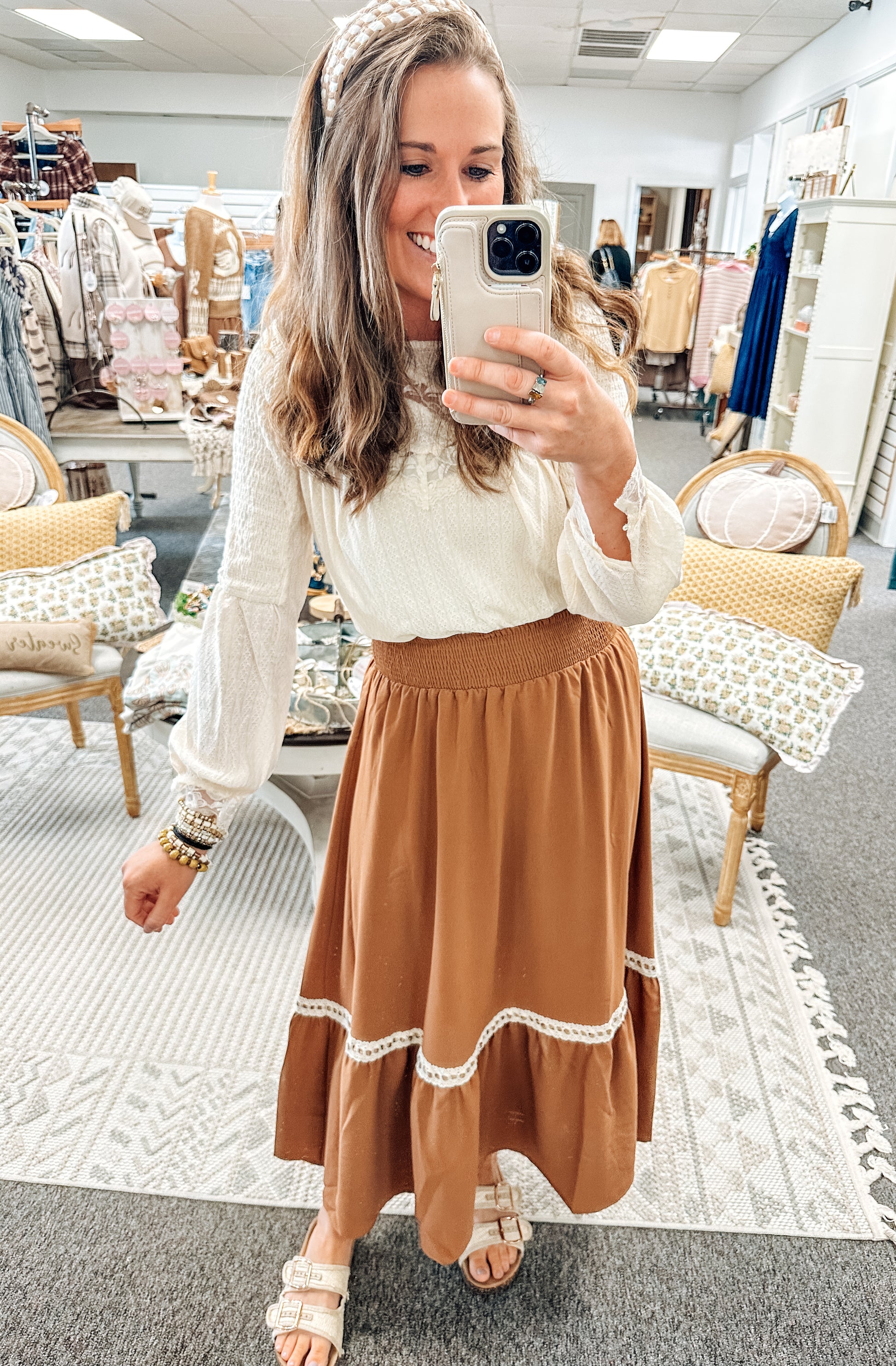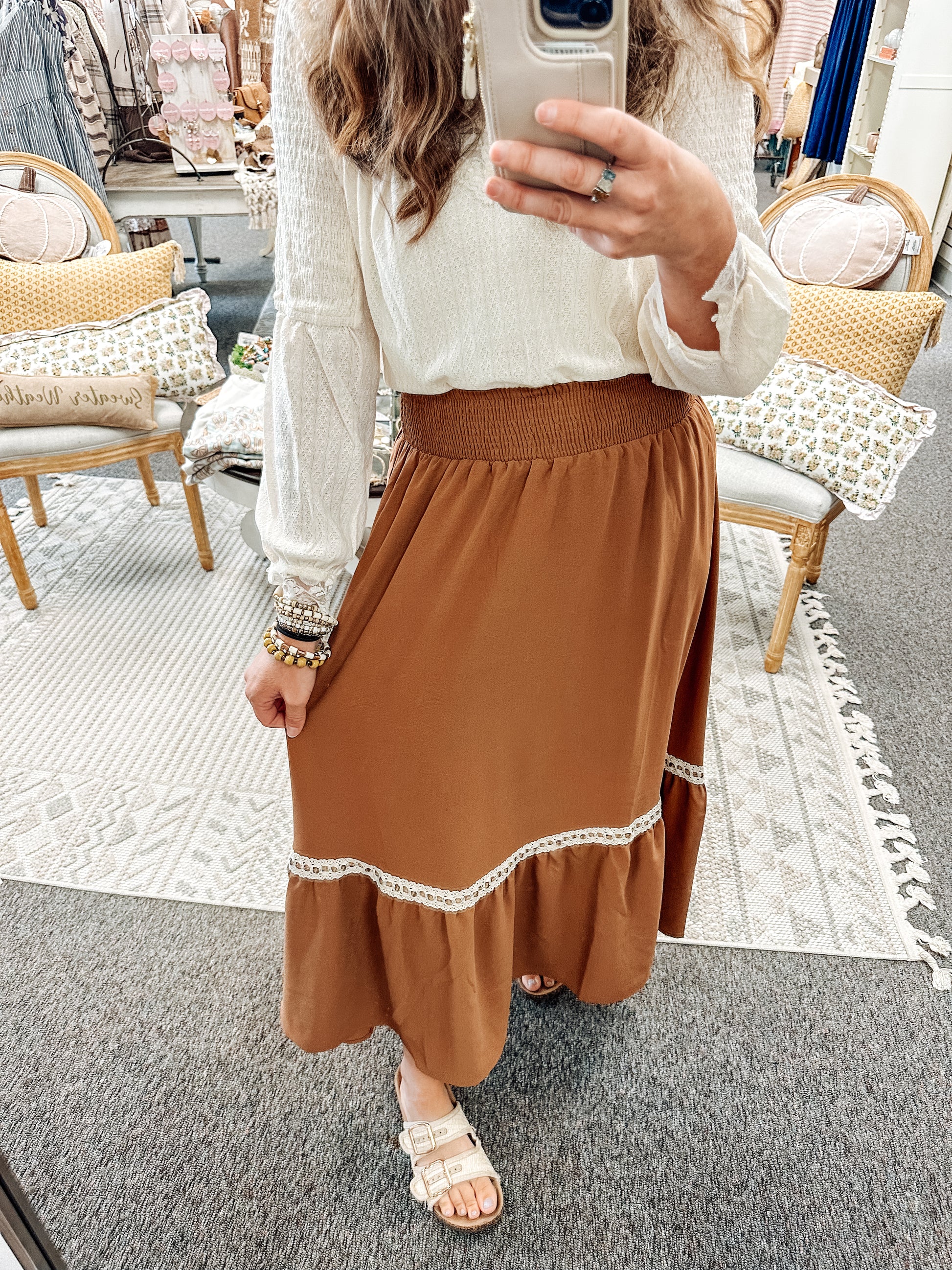 This playful midi skirt features a high, smocked elastic waist for a comfy fit and a flattering A-line silhouette. The contrast lace trim with delicate ribbon adds a touch of charm, while the ruffle hem brings a flirty finish. Fully lined for comfort, it’s perfect for twirling into any occasion with style and ease.