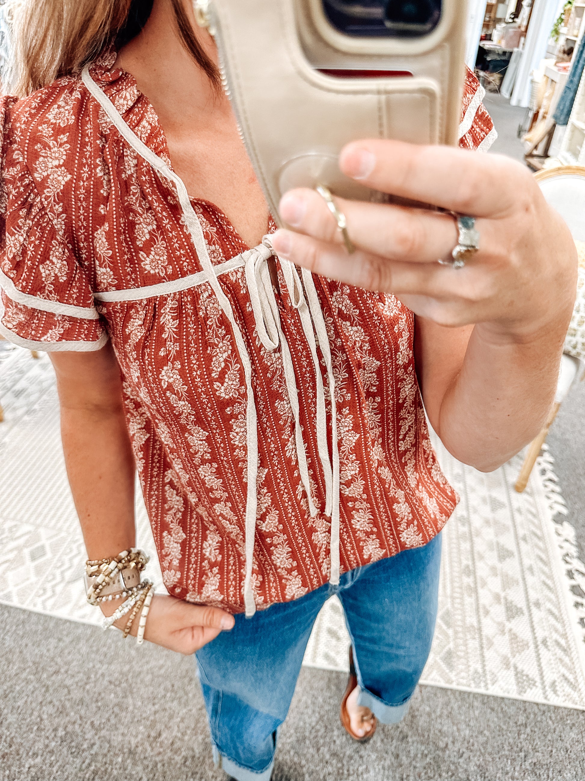 This Moody Fall Striped Blouse in rich burgundy features a playful V-neck and charming short ruffle layered sleeves. The double front tie and ruffle trim add flirty details, while the relaxed fit and lightweight woven fabric keep you comfy all day. With its stripe floral pattern, this unlined top is perfect for layering or wearing solo to brighten up your fall wardrobe. Available in sizes S-3X for a flattering fit everyone will love!