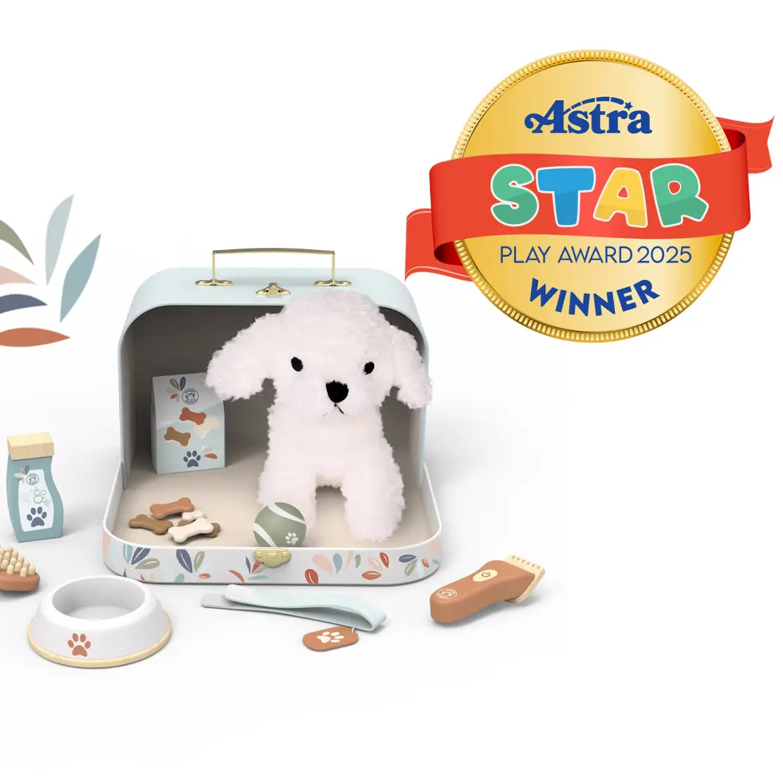 Children will have everything they need in this beautifully designed suitcase to take care of their favorite dog plush (included). Features dog snacks, bowl, brush, collar and a few more accessories. Plan your trip and take along all that is needed for you and your dog to live fun adventures! This toy is crafted from sustainably sourced wood from FSC® certified forests and coated with non toxic paint.