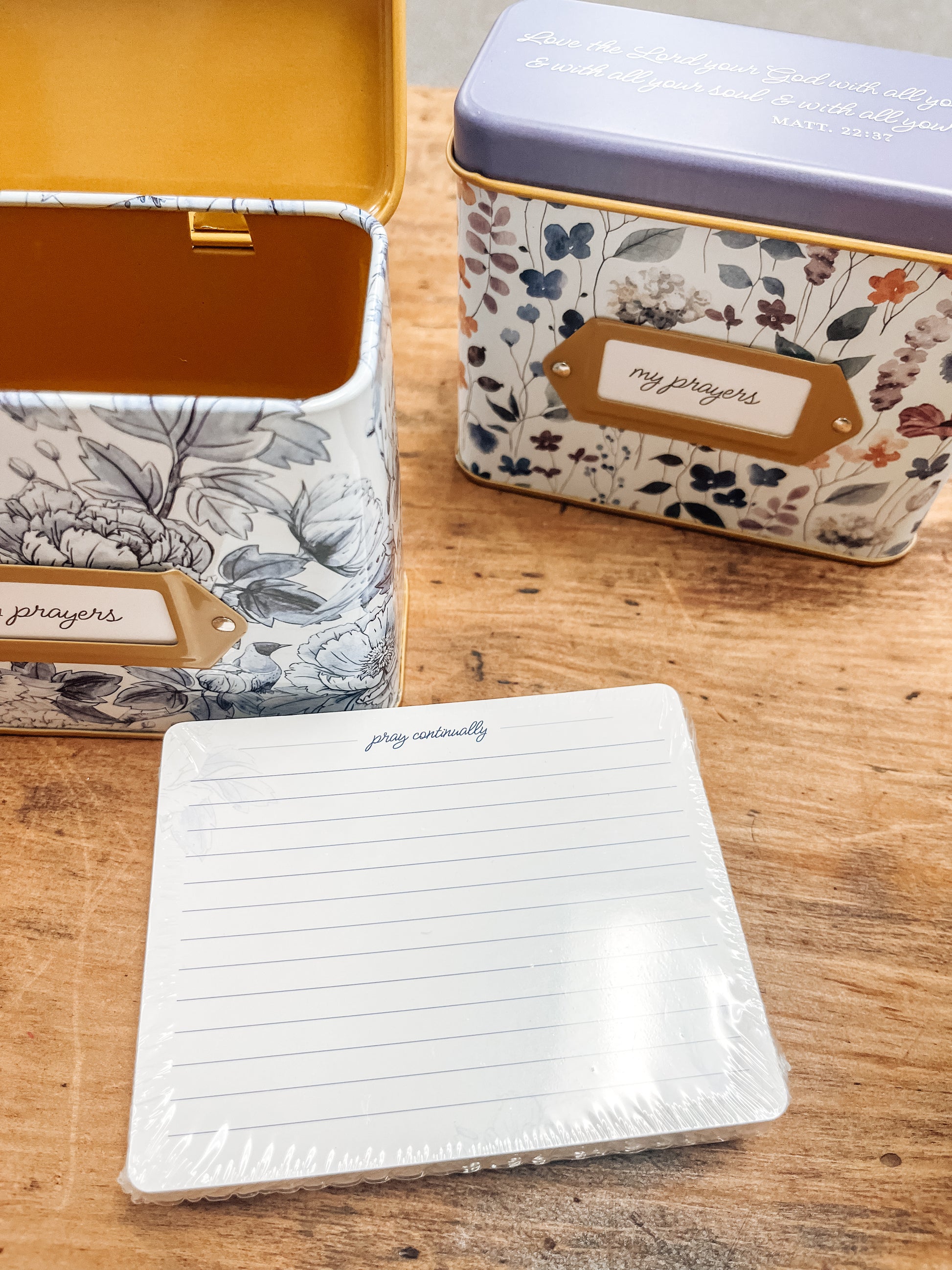 The Love the Lord Purple Wildflower Prayer Cards in Tin is a collection of prayers centered around our love for God. This collection of prayers will put into words the deep love of historical and contemporary Christians and guide you to share in their worship. Purple wildflower floral design, White background, Brass metal tin, Tight-fitting hinged lid, Purple lid, White printed Scripture verse on lid, Love the Lord your God with all your heart and with all your soul and with all your mind., Matthew 22:37, 50 double-sided cards, Lilac with wildflower design, Prayer on front, Lined space on back, Card size: 4.4" x 3.5" (112 x 89mm) Tin size: 5.2" x 4.1" x 2.4"