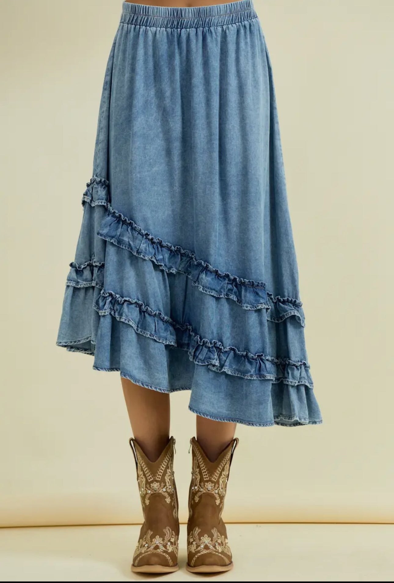 Experience effortless style with On the Western Side's asymmetrical ruffle midi skirt! Featuring a stretchy elastic waistband, this versatile piece pairs perfectly with blouses, sweaters, or bodysuits. Elevate your wardrobe with this must-have addition.
