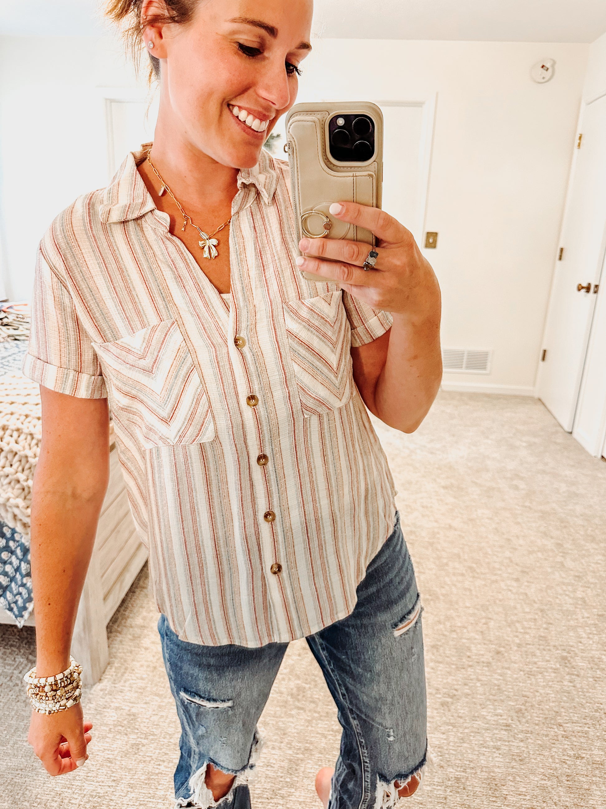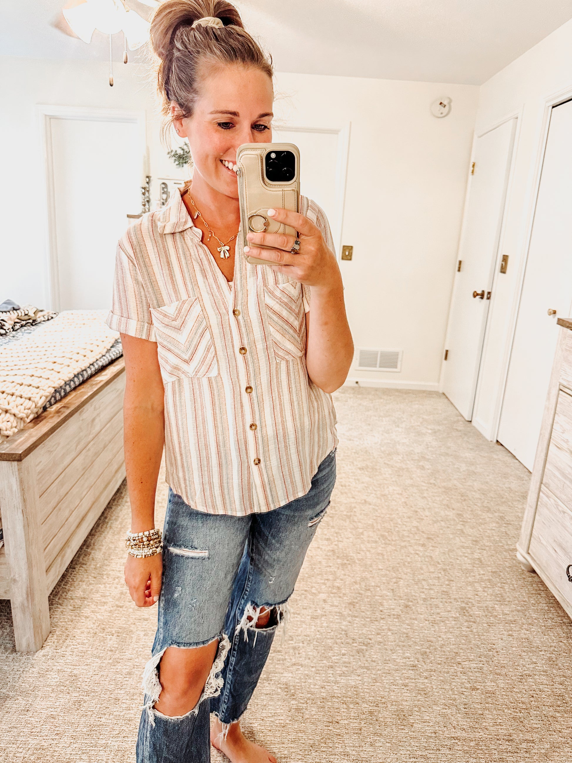 This playful Painted Lines Button Down features a vibrant multicolor stripe pattern that adds a splash of fun to your wardrobe. Designed with a classic collar and short sleeves, it offers a breezy, comfortable fit. The button-down front and chevron-patterned pockets bring charming details that stand out. Crafted from woven fabric, this top is perfect for adding a lively touch to any casual outfit. Available in sizes S to 3X for a flattering fit on everyone.
