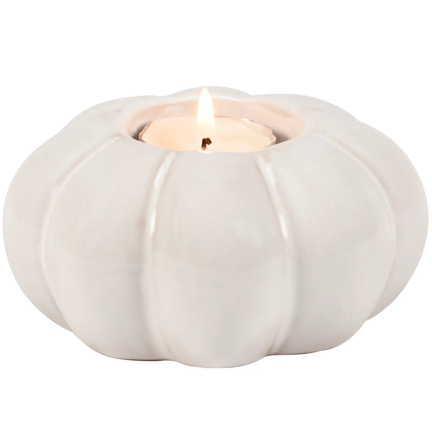 A ceramic candle holder that coordinates well with décor from our Fall & Harvest Collection. Candle holder features a cream glaze base with sculpted pumpkin design and center slot for a single candle. Our Pumpkin candle holder fits a standard tealight candle and can free-stand on flat surface. Candle pictured not included. A charming seasonal home accent perfect for adding natural lighting to any living space.