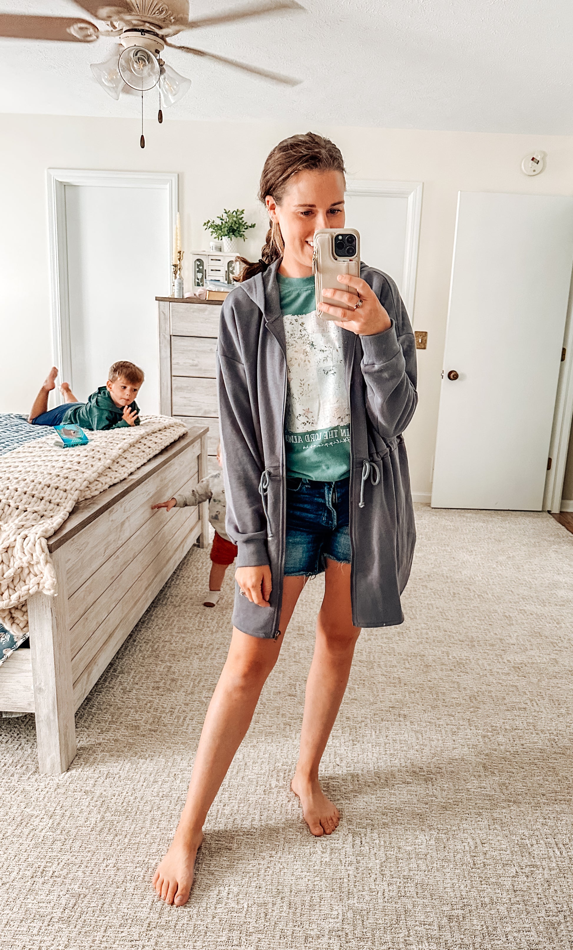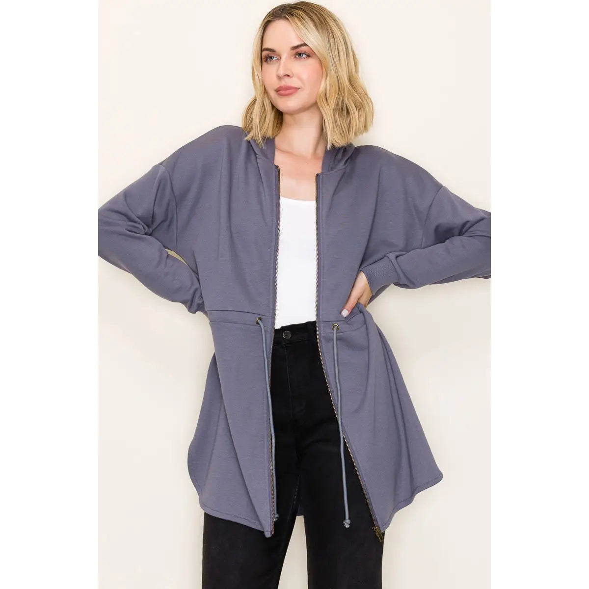 Wrap yourself in cozy charm with this Pure Comfort Terry Hoodie Jacket in Light Gray. Featuring a drawstring waist for a perfect fit, long sleeves, and a zip-up front, this duster-style hoodie blends comfort and style effortlessly. Made from soft French terry fabric, it’s your go-to for laid-back days with a playful twist.