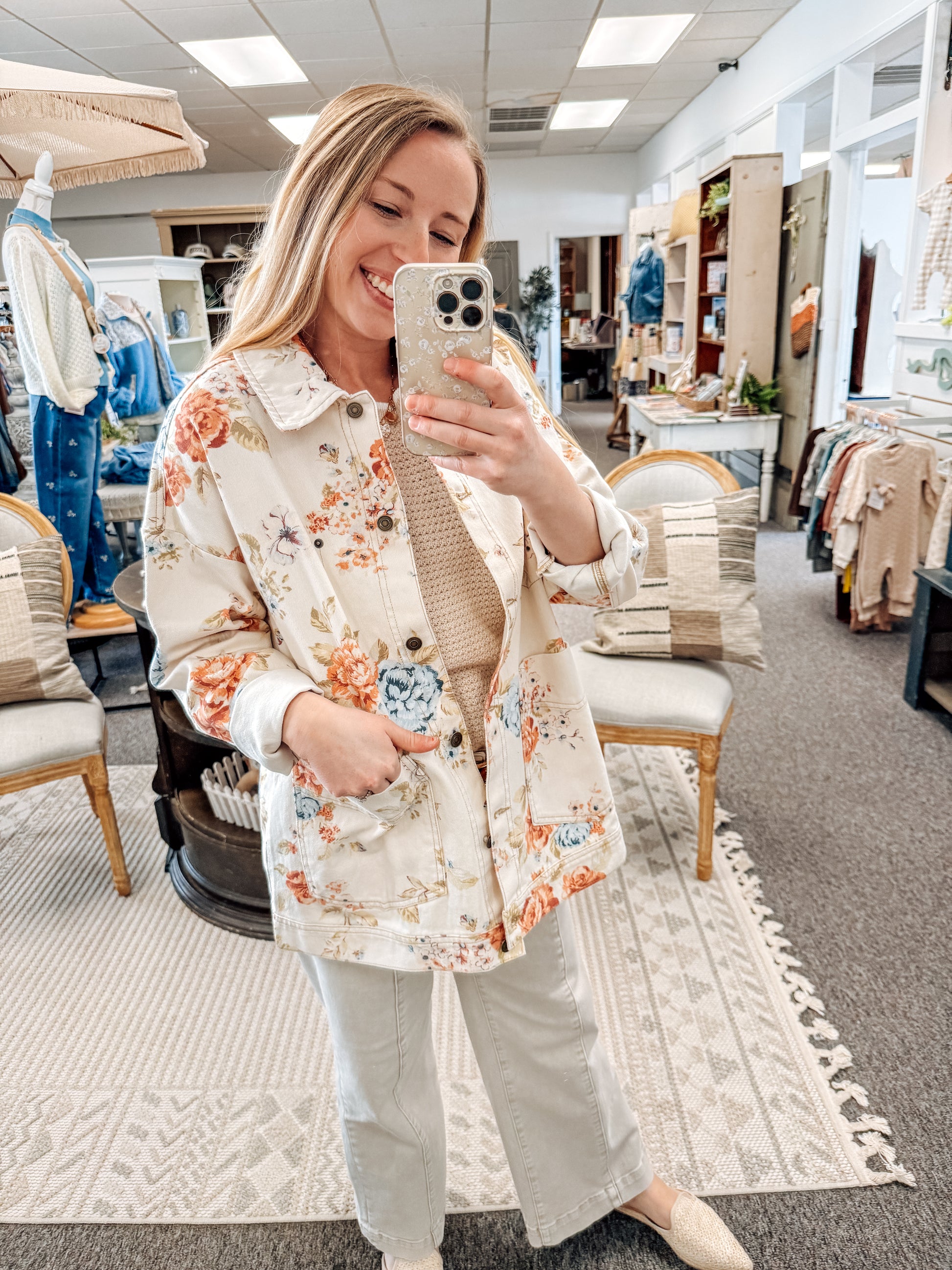 Elevate your everyday style with this charming denim jacket that blends classic structure with modern flair. Featuring a crisp collar, button-down front, and practical pockets, it's designed for effortless layering. The ecru denim base is beautifully adorned with a delicate floral print, adding a touch of personality to your wardrobe. Long sleeves provide versatile coverage, while the unlined construction keeps it lightweight and breathable. Perfect for transitional seasons or layering year-round, this jacket is your go-to piece for casual sophistication.