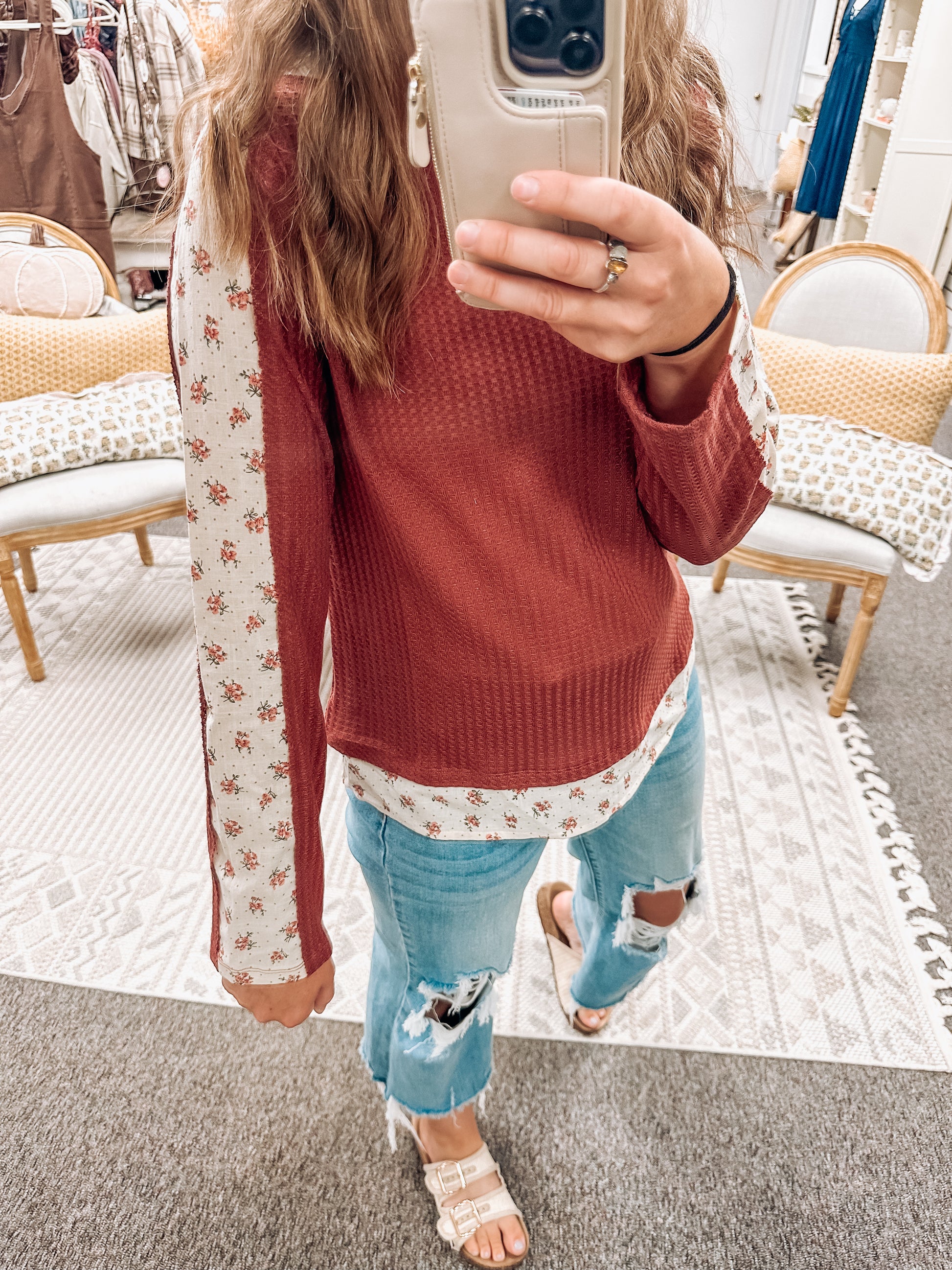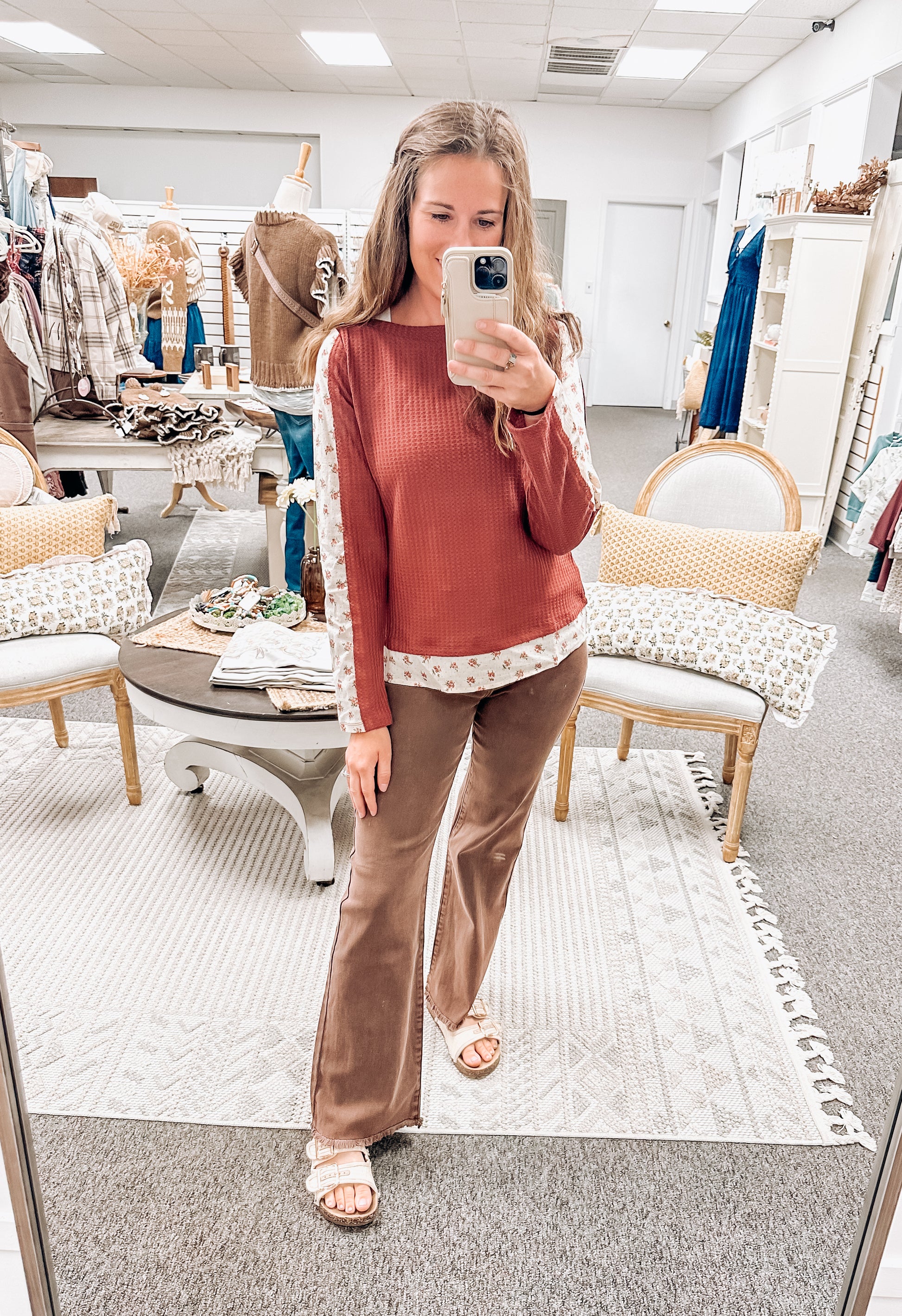 The September Petals Waffle Knit Top in Marsala combines a soft waffle texture with a delicate floral woven combo design. Featuring a flattering boat neck and refined cut edge details, this top offers a gentle, comfortable fit that supports your everyday style. Perfect for layering or wearing on its own, it adds a warm, inviting touch to any outfit while keeping you cozy throughout the day.