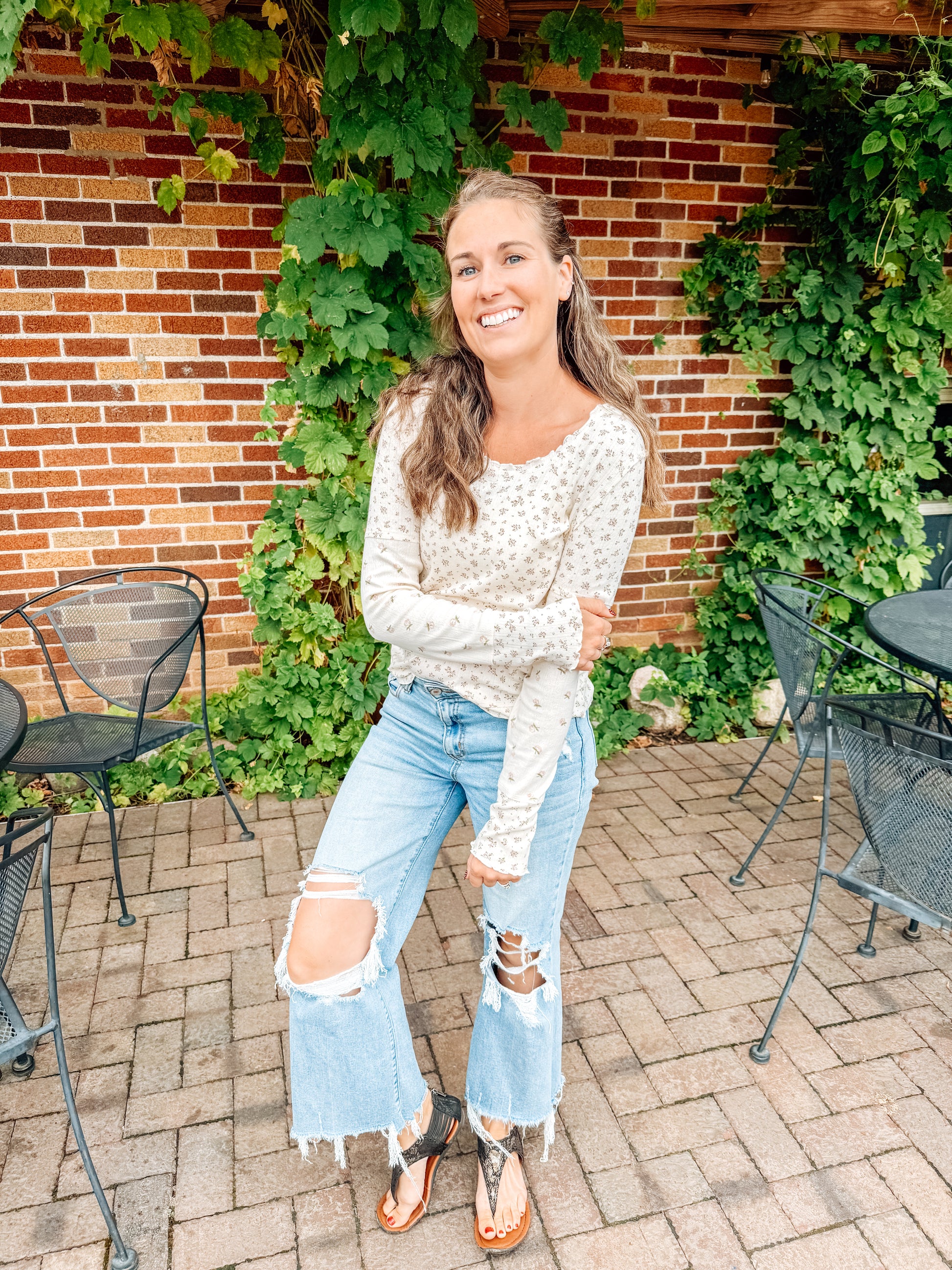 Get ready to bloom in style with our Shadowed Petals Lettuce Hem Top! Featuring a playful floral print and trendy lettuce hem, this transitional top will take your outfit to the next level. With a round neck, long sleeves, and the option to pair with a vest, this top is the perfect addition to your wardrobe.