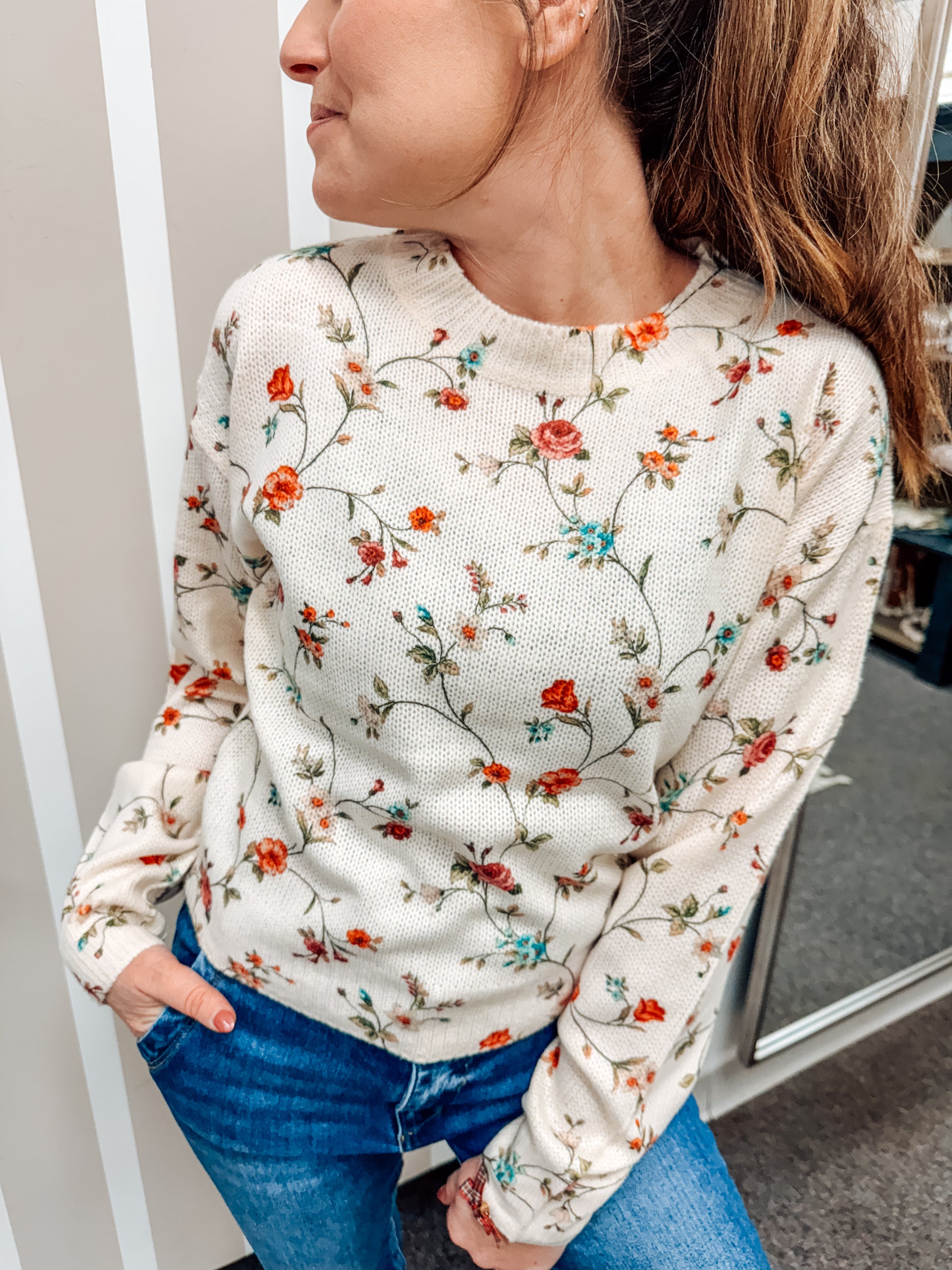 Picture yourself wandering through a blooming meadow in this delightful floral print crewneck sweater. Crafted from a luxuriously soft knit fabric, it's the perfect companion for layering or standalone wear. The cheerful botanical pattern brings a pop of personality to your closet, while the classic crewneck silhouette keeps things timeless and easy to style. From casual coffee dates to weekend adventures, this sweater (available S-XL) is ready for whatever your day brings—with a sprinkle of floral charm.