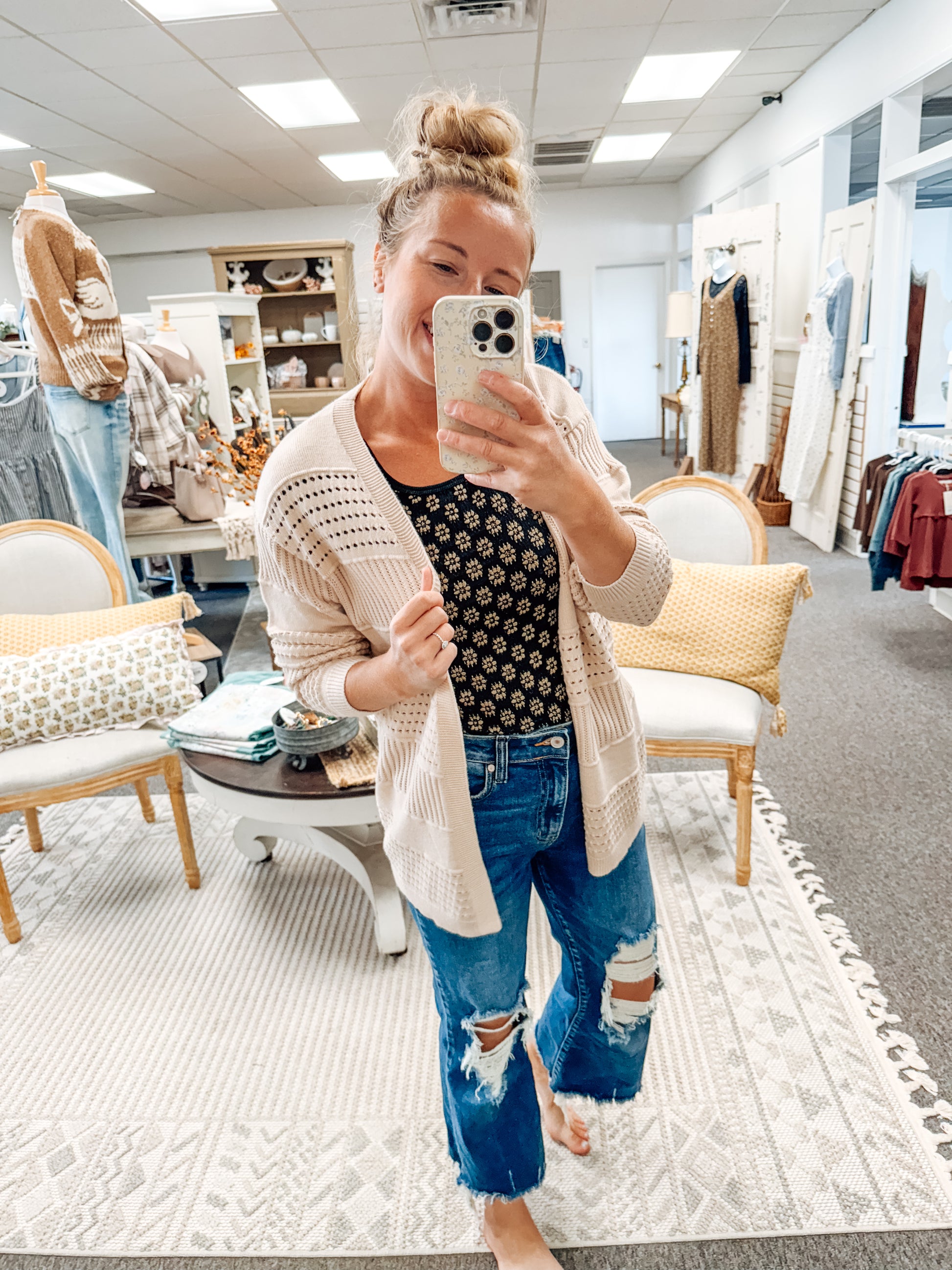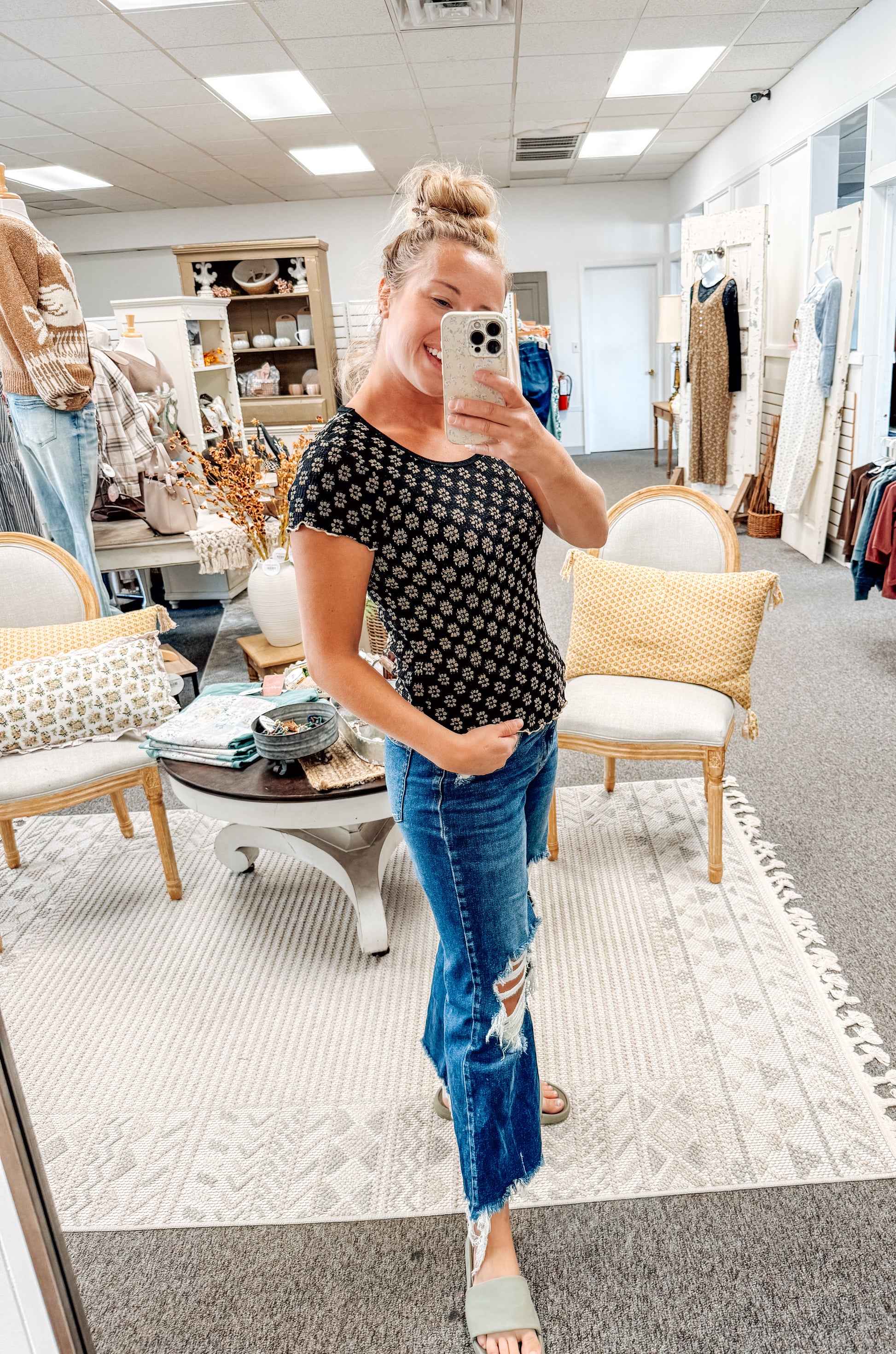 These high-waist cropped denim pants bring a fun edge to your wardrobe with distressed knees and raw, frayed hems. Slim through the hips and thighs, they flare out slightly at the leg opening for a playful twist on classic denim. Perfect for adding a bit of attitude to any casual look!