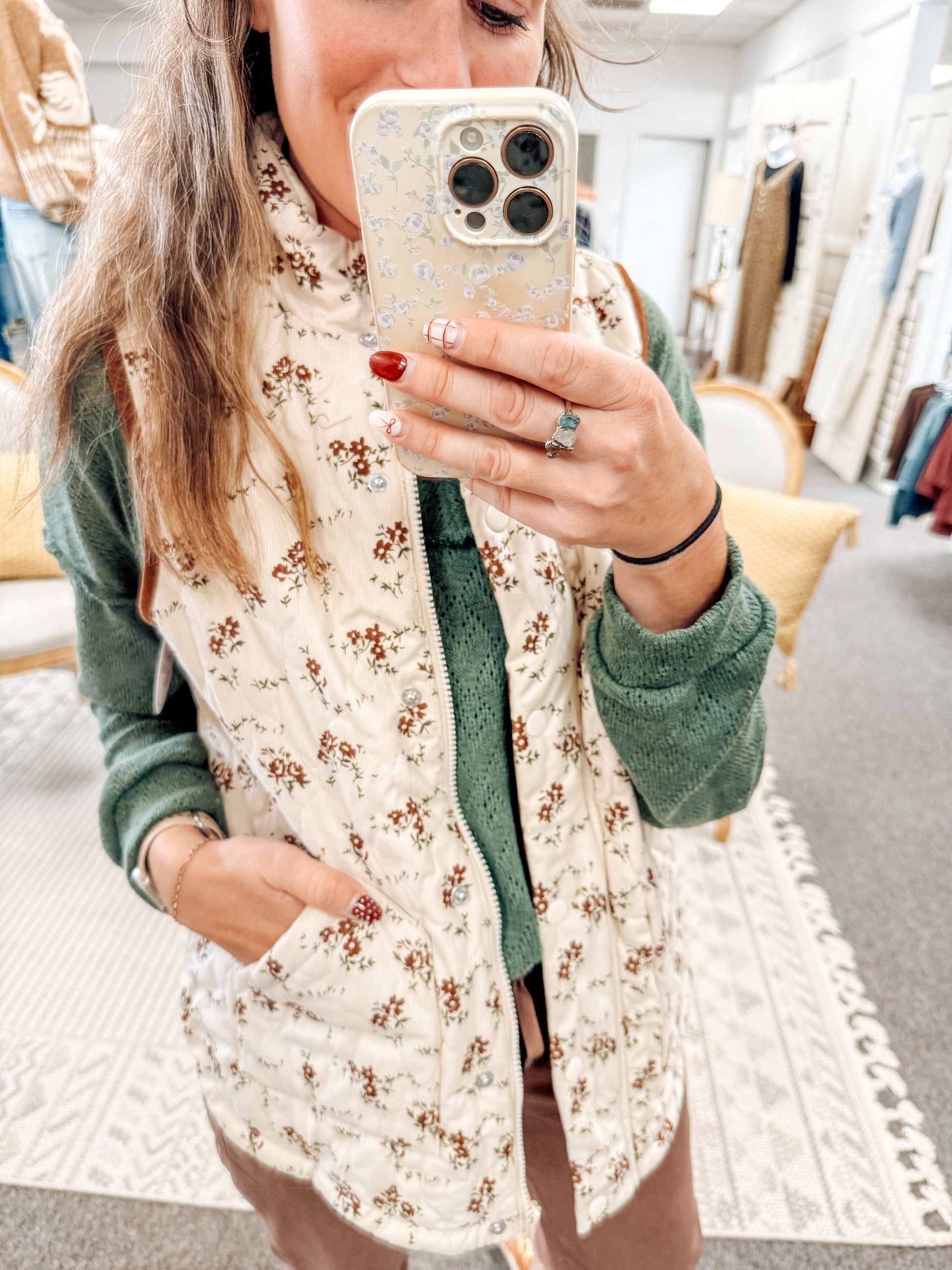 Stay cozy and stylish with The Stitched Garden Puff Zip Vest, featuring a charming floral print and convenient zip-up design. Crafted with quilted fabric, this vest offers warmth without bulk while the handy pockets keep essentials close. Perfect for layering from S to XL sizes, it supports your comfort and fashion effortlessly throughout the day.