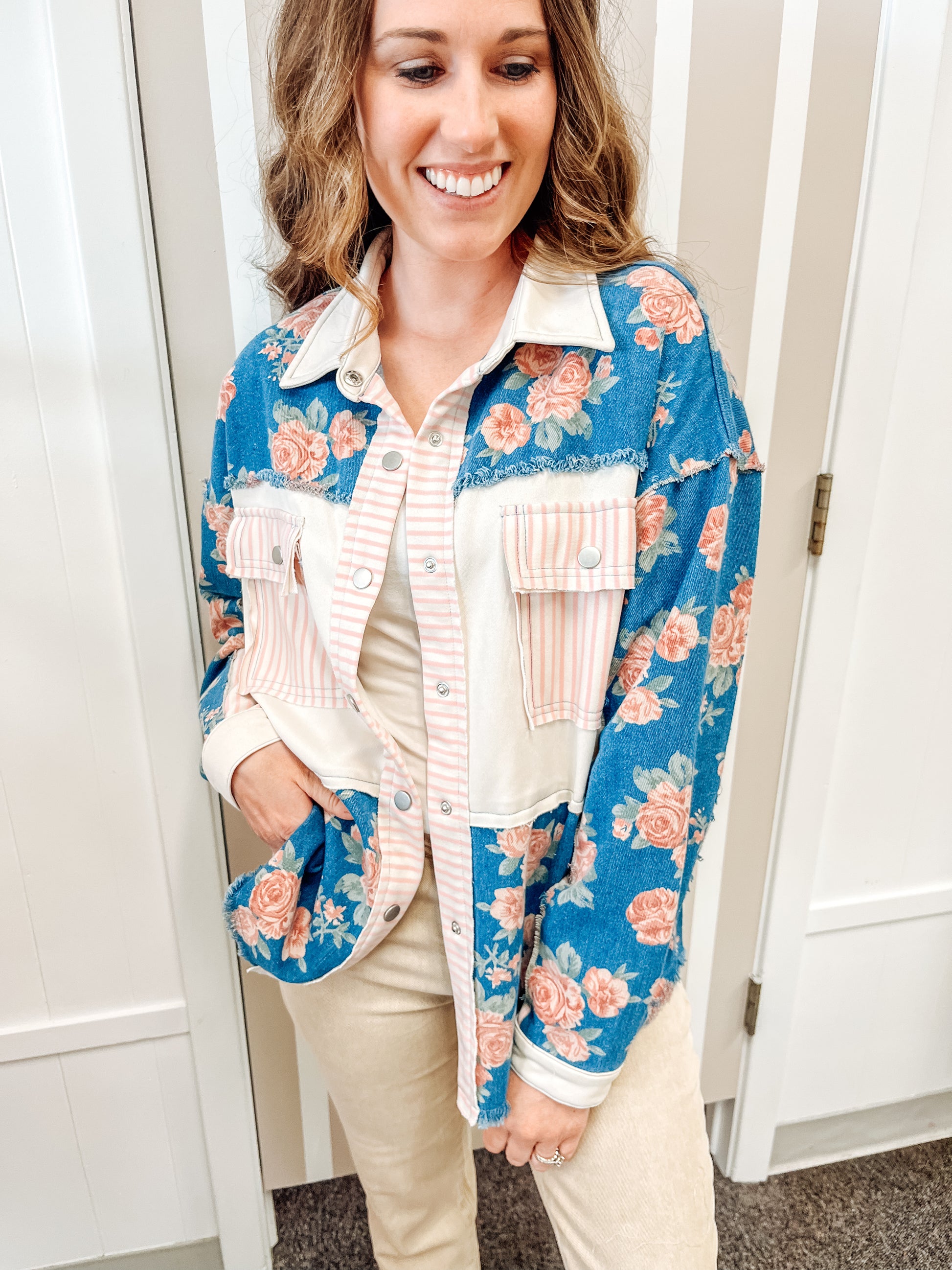 Embrace the season's trend with our Transition to Florals Button Up. This washed printed denim mix and match shirt top features contrasting cut edge detail for a unique touch. Perfect for adding a fun and playful element to your wardrobe, wear it with jeans or a skirt for a versatile and stylish look.