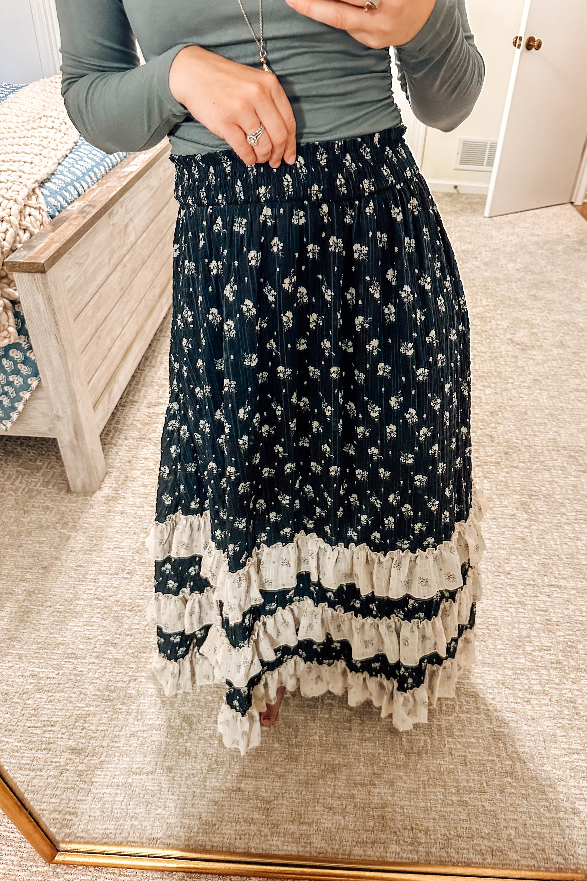 Indulge in the luxury of our Twirl Me Floral Maxi Skirt. Its smocked elastic waist ensures a perfect fit, while the contrast ruffles add a touch of sophistication. The navy and ivory colors, lined for comfort, create a romantic floral print that is perfect for any occasion. And with the added bonus of side pockets, convenience and style go hand in hand.