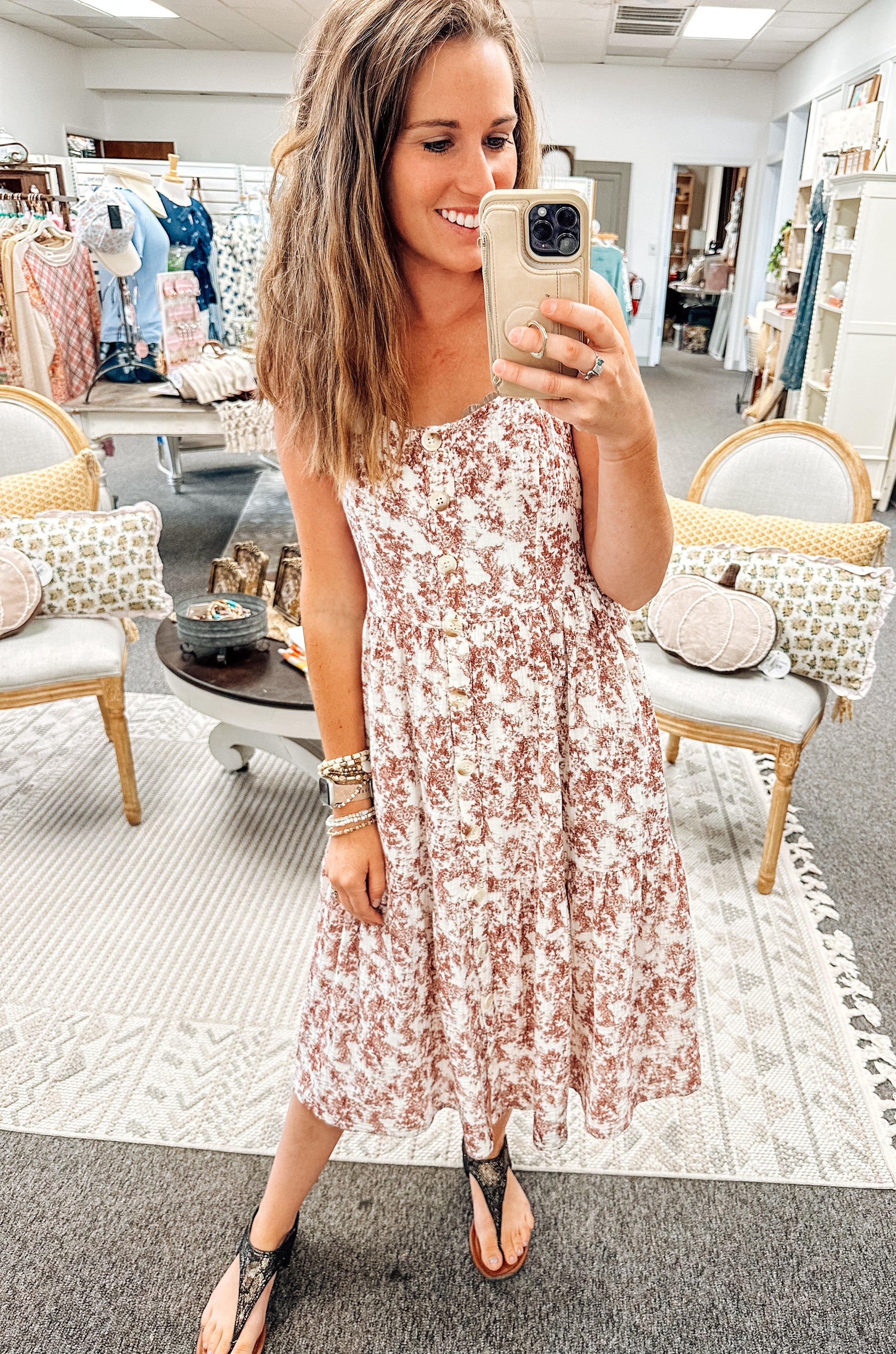 Embrace timeless charm with the Vintage Merlot Midi Dress, featuring a delicate floral print on woven twill fabric. This sleeveless jumper dress offers convenient pockets and versatile styling—perfect layered with a cozy sweater or a chic vest for a polished look. Ideal for effortless elegance any season.