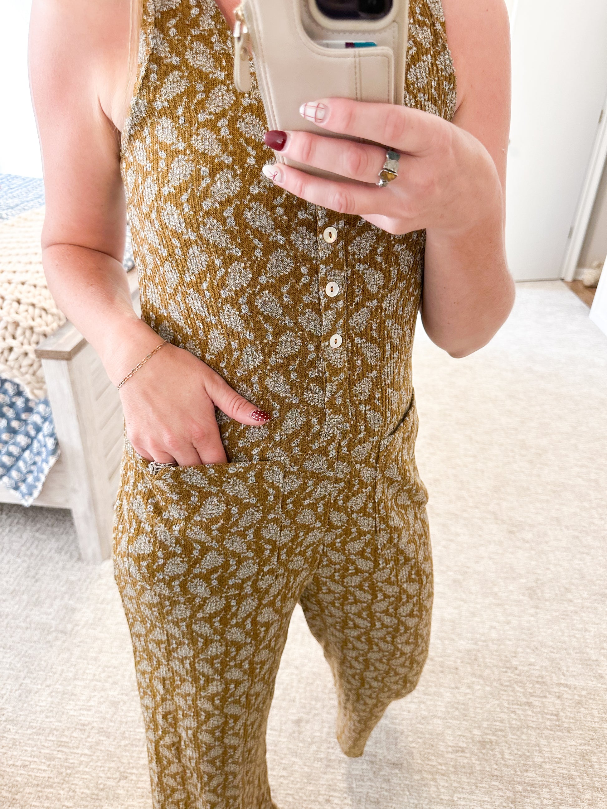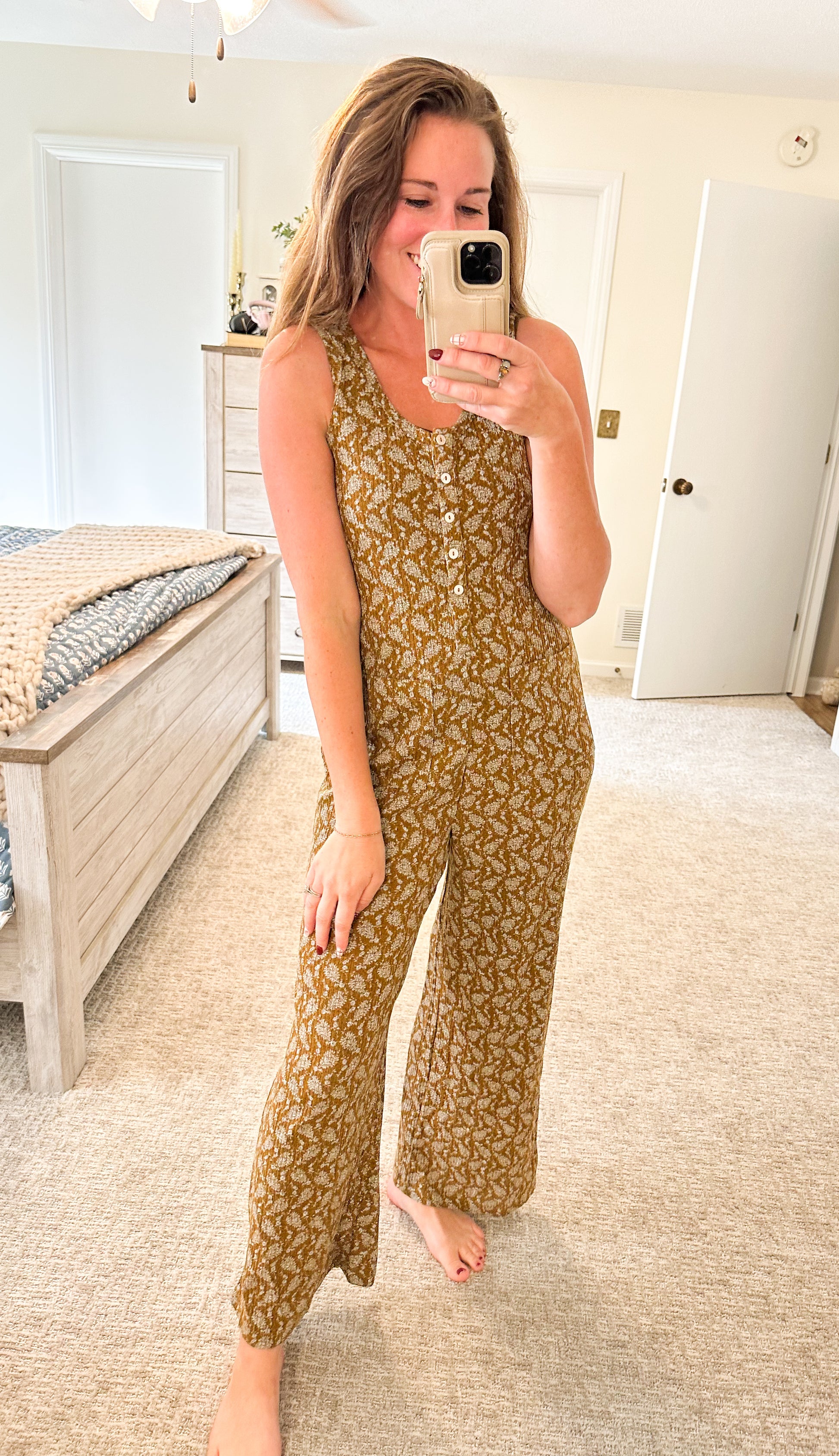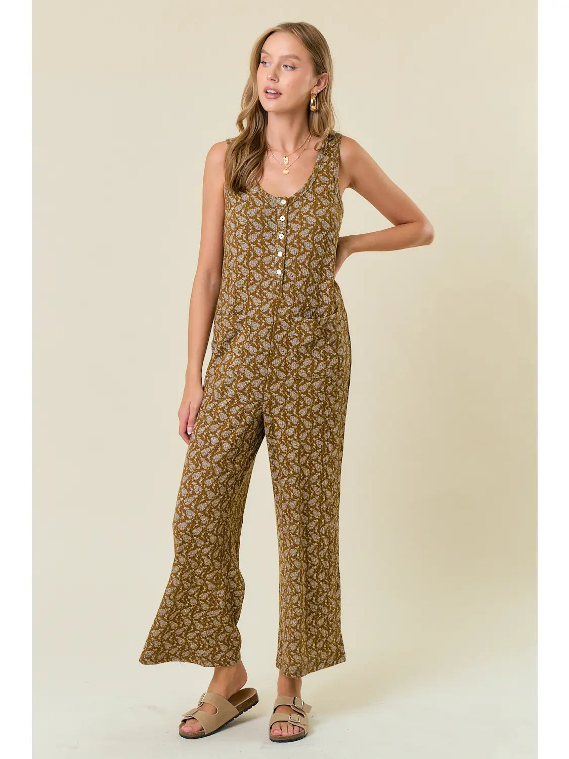 Embrace effortless style with the Wildflower Waltz Jumpsuit. This sleeveless piece features a chic paisley print and a front button placket with decorative white buttons for easy dressing. The scoop neckline adds a delicate, feminine touch, while the wide-leg silhouette ensures a relaxed and comfortable fit all day long. Perfect for any occasion, this jumpsuit combines fashion and comfort seamlessly.